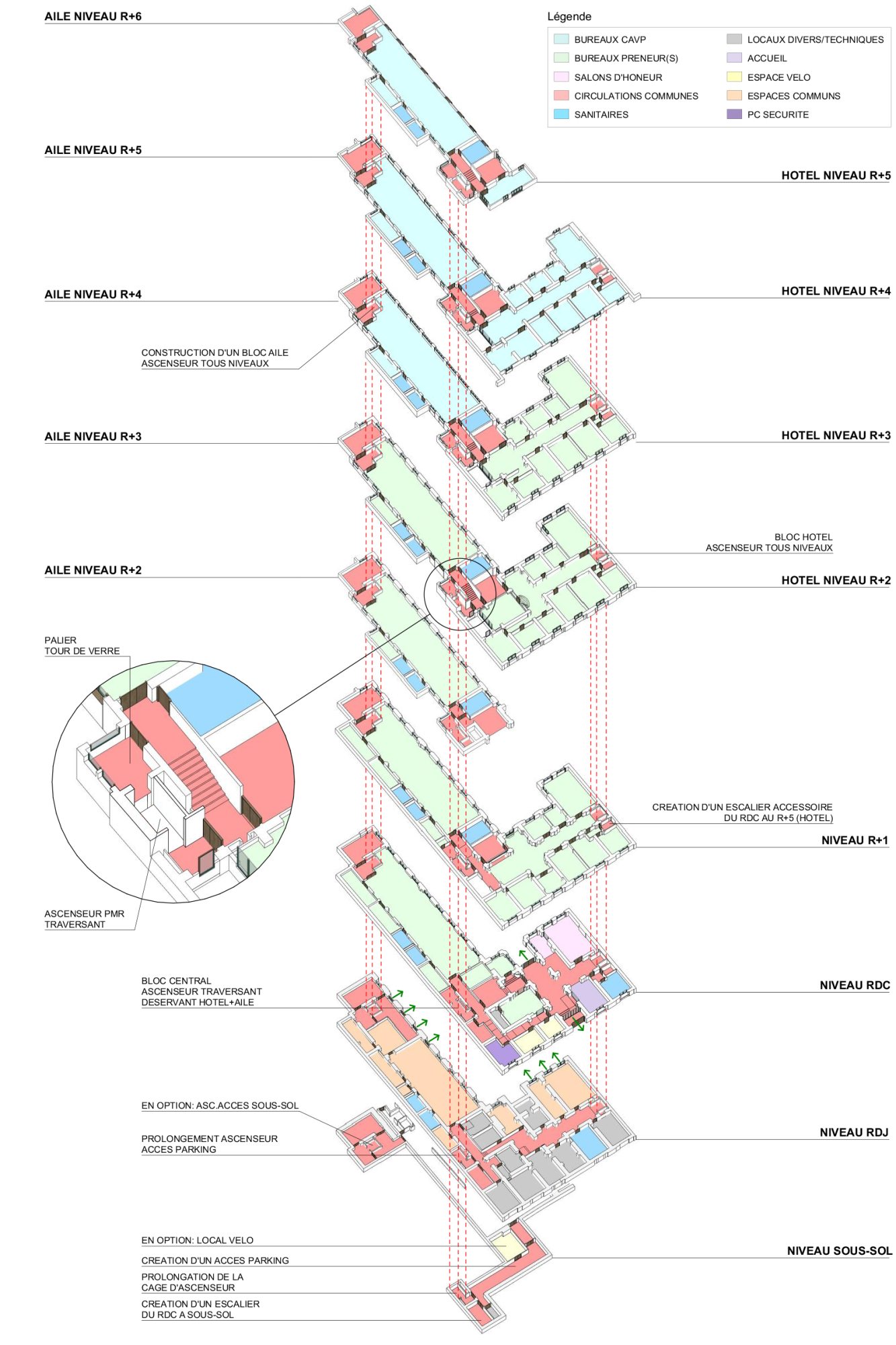 Nous proposons de restructurer et rationnaliser l’édifice et ses deux corps, afin de permettre une plus grande fluidité dans les circulations, et une souplesse dans l’allotissement (avec une possibilité des séparations des lots à chaque niveau entre hôtel et aile, afin de garder la potentialité de location à de multiples preneurs).