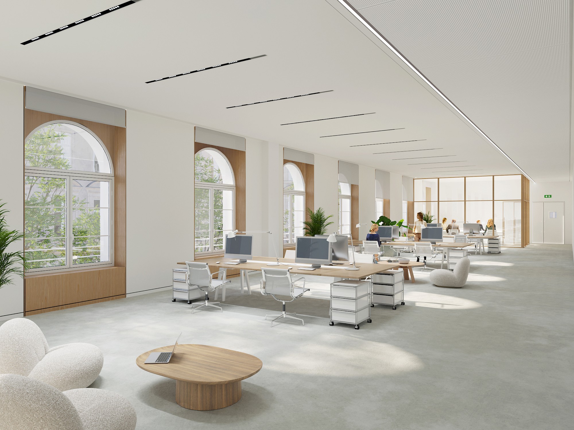Une cafétaria inter-entreprises dans l’aile permettra une ouverture directe sur des terrasses dans le jardin, afin que chacun puisse profiter d’un café ou d’un déjeuner dans ce paradis vert.Au rez-de-chaussée :