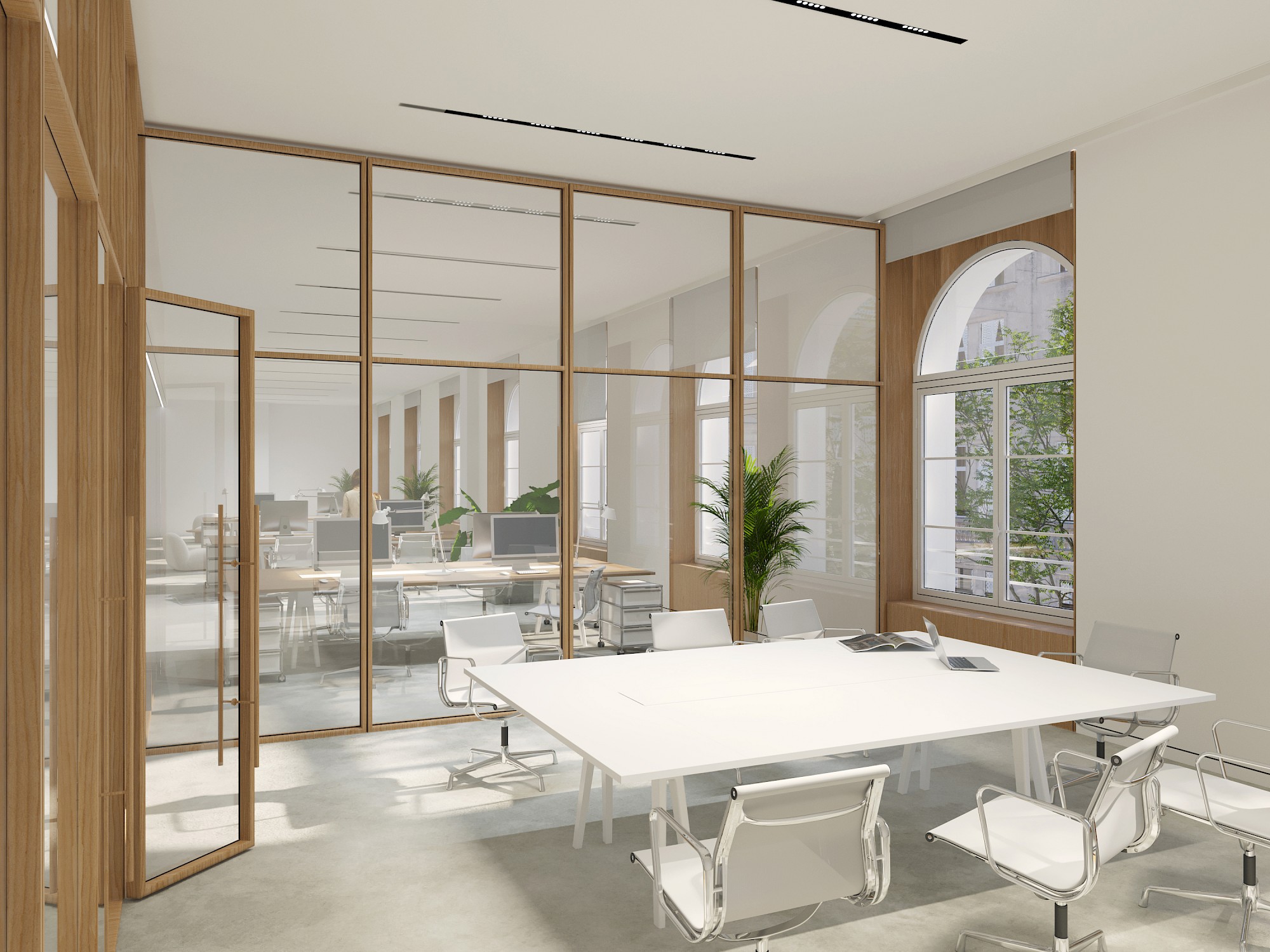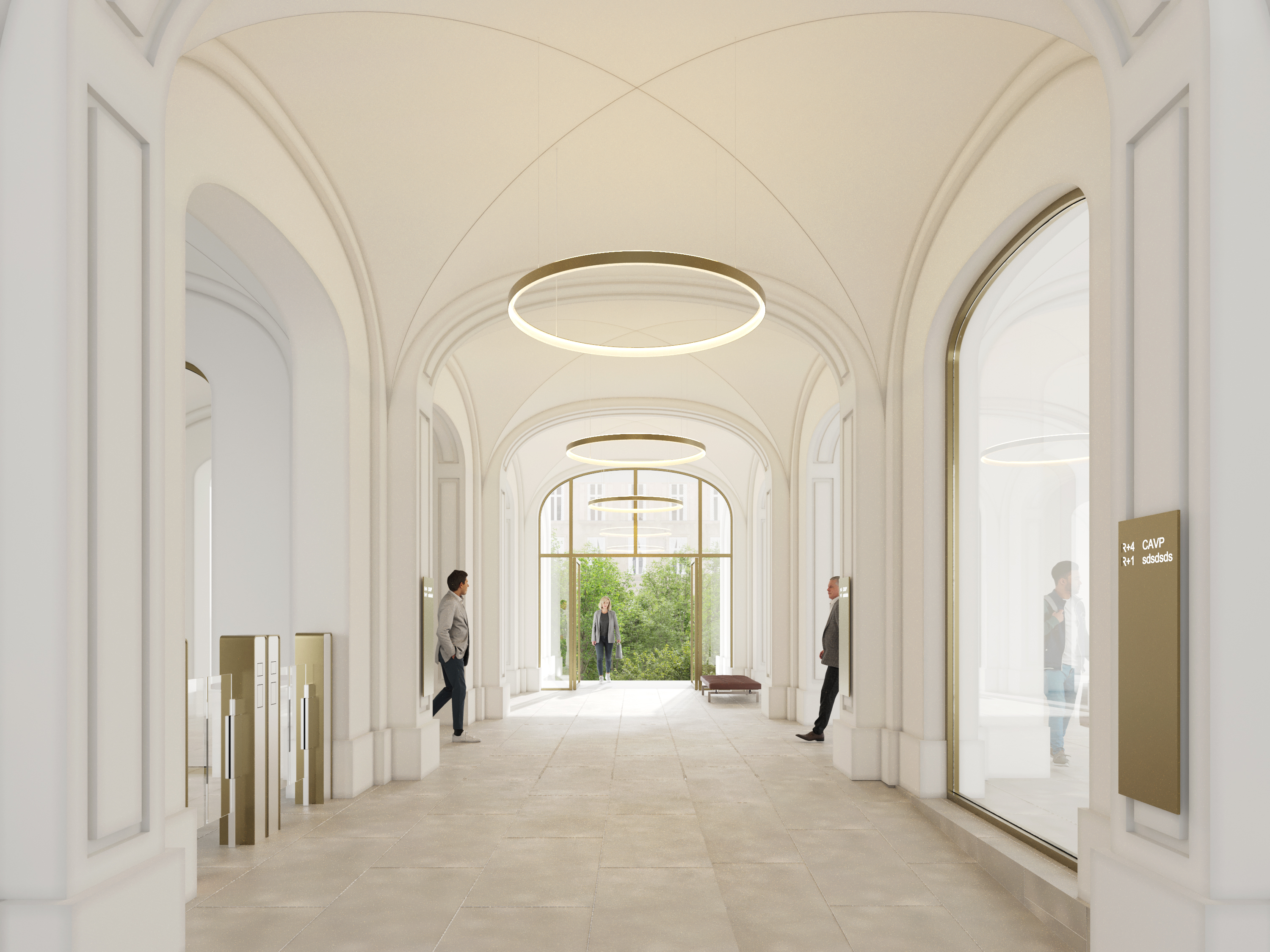 En libre accès, l’entrée et le hall mettent en valeur la perspective sur le jardin, pour un accès généreux et direct. Des espaces d’attente, avec banquettes et aménités prendront place dans le hall. L’accueil est déplacé en façade sur rue en liaison avec l’entrée, et en contrôle de la zone privatisable du Salon d’Honneur.En étages :