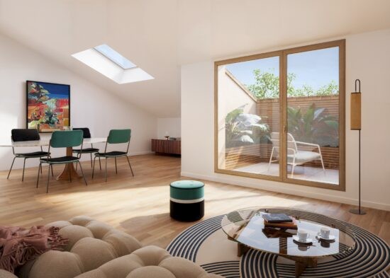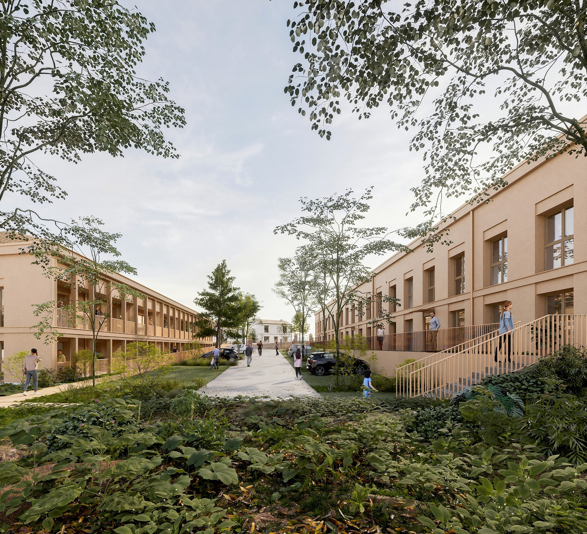 Ce projet de 47 logements (social et accession), répartis sur deux bâtiments a été pensé pour offrir un cadre de vie à la fois harmonieux, convivial et durable. Il combine une architecture soignée et des solutions respectueuses de l’environnement, répondant ainsi aux besoins d’esthétique, de confort et de durabilité : Rue intérieure : un espace central et écologique La rue intérieure structure le projet en assurant les circulations tout en offrant un espace d’échanges convivial. • Espaces verts intégrés : La végétalisation crée une atmosphère agréable. • Gestion écologique des sols : Pavés drainants et surfaces perméables favorisent la gestion des eaux pluviales et réduisent l’imperméabilisation des sols. Façades nord : sobriété et efficacité Côté nord, les façades mettent en avant une esthétique sobre et moderne qui s’associe à une conception durable. • Matériaux durables : Bois, béton, métal et briques garantissent longévité et modernité. • Lumière naturelle optimisée : Les ouvertures stratégiquement positionnées améliorent l’éclairage intérieur et minimisent les pertes énergétiques. Façades sud : balcons en bois et confort Les façades sud se distinguent par de grands balcons en bois, pensés pour améliorer le confort et l’esthétique. • Chaleur et durabilité : Le bois apporte une touche naturelle tout en répondant aux critères environnementaux. • Protection solaire : Les balcons jouent le rôle de brise-soleil, limitant les surchauffes estivales. Jardins privatifs : nature et sérénité Les logements en rez-de-chaussée profitent de jardins privatifs aménagés pour allier confort et biodiversité. • Écosystèmes variés : Une végétation diversifiée favorise la biodiversité locale. • Intimité préservée : Haies et clôtures végétalisées assurent discrétion et unité esthétique. Tropéziennes sous combles : ouverture et lumière Les logements sous combles sont dotés de tropéziennes, véritables espaces de bien-être. • Espace lumineux : De grandes baies vitrées ouvrent sur le ciel et inondent les intérieurs de lumière naturelle.