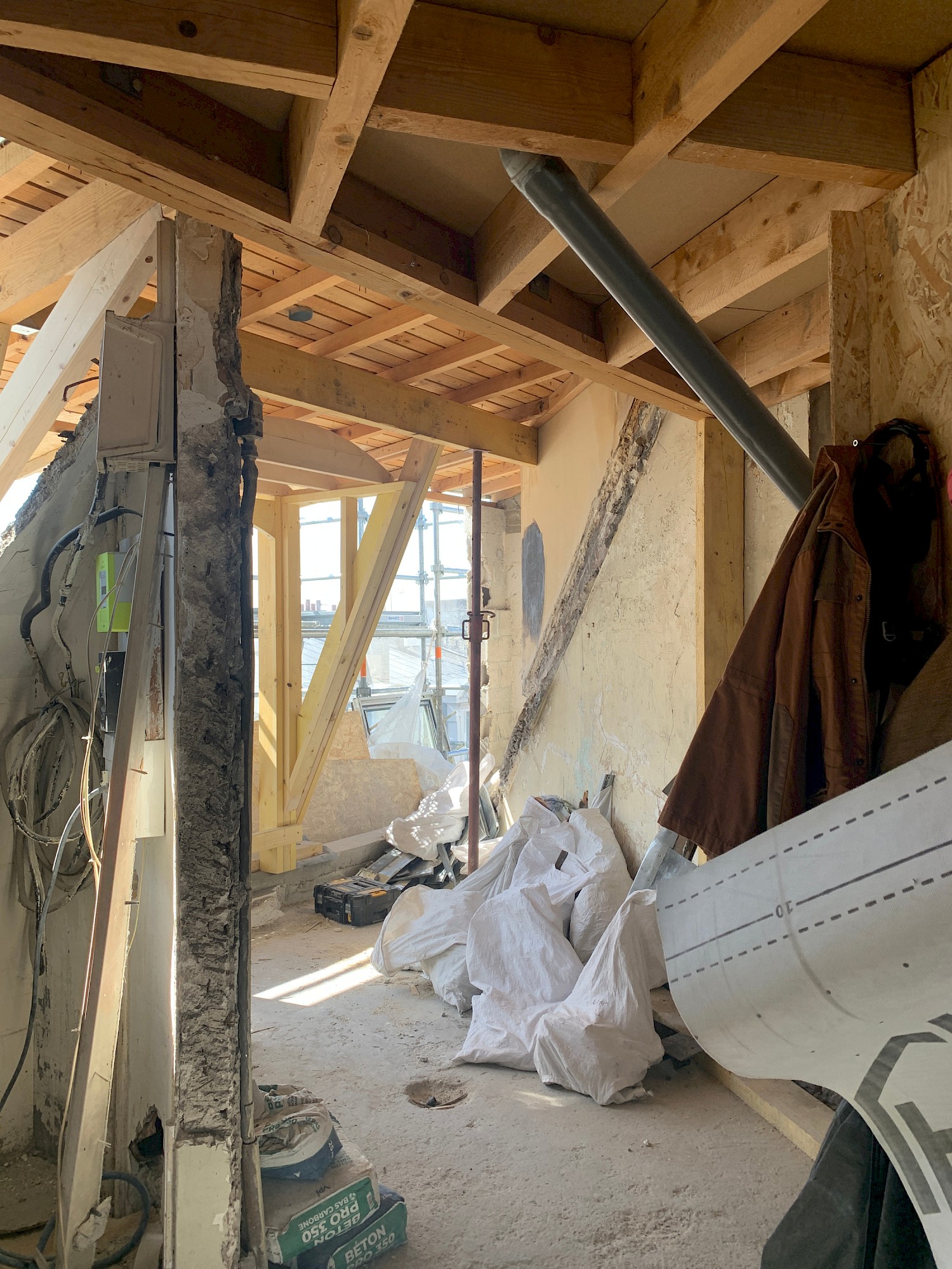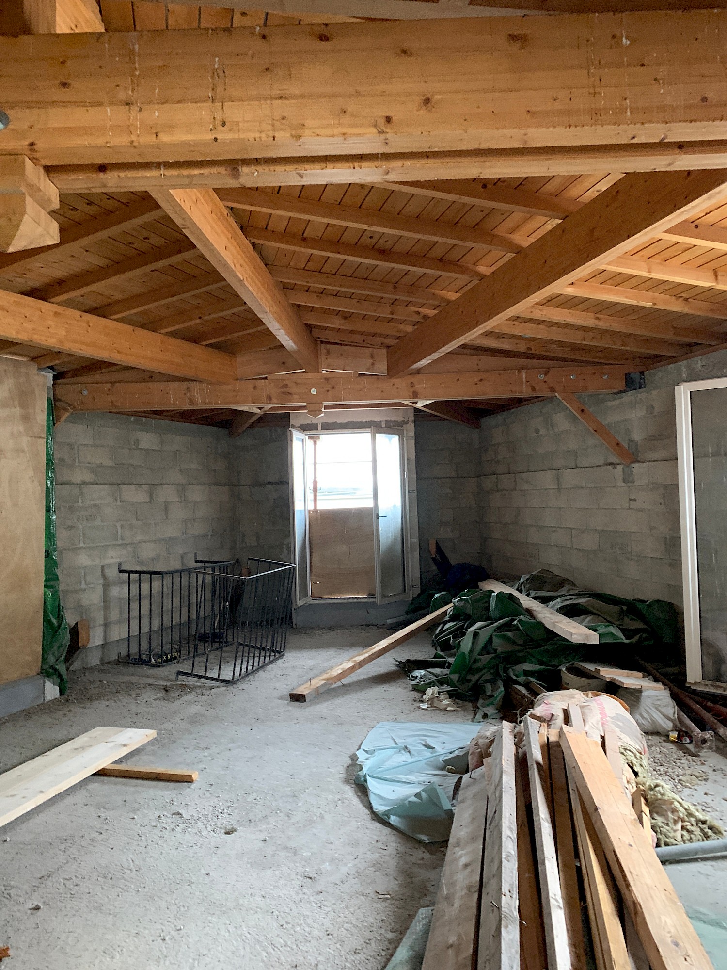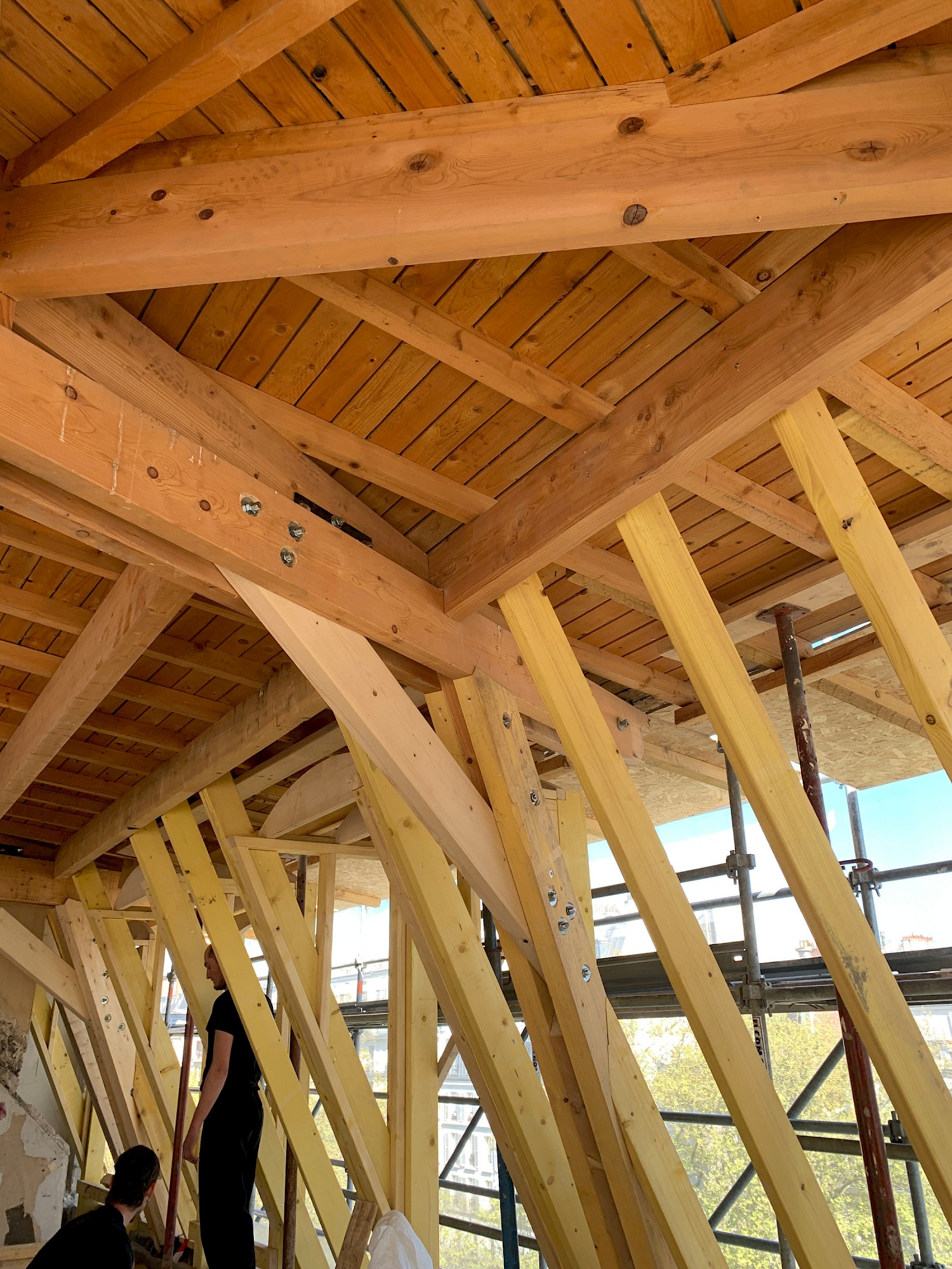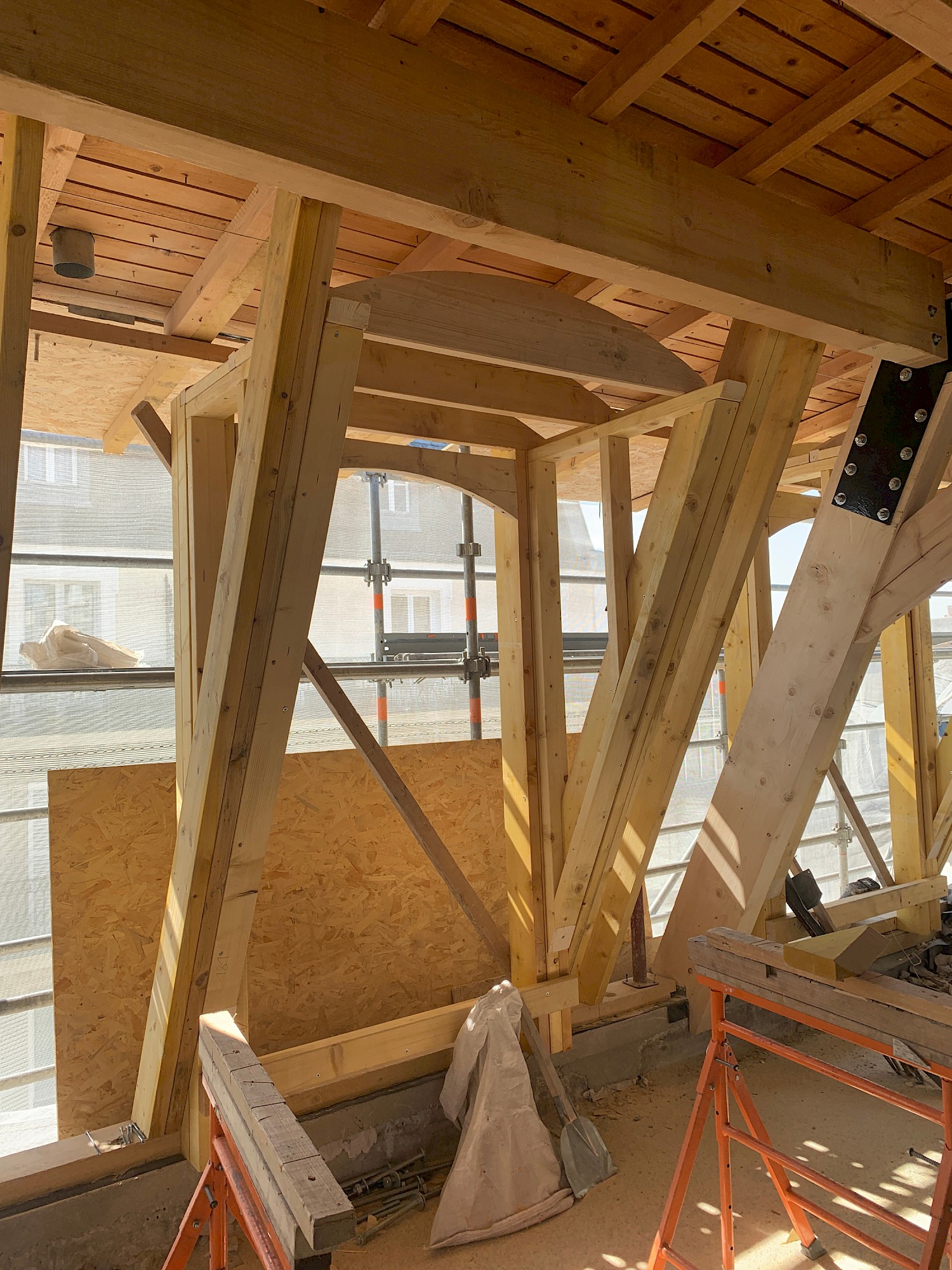 Modification d’une charpente construite sans autorisation en vue de la création d’une mansarde classique avec terrasse en toiture : dépose du faux brisis construit en parpaings, création à neuf d’une charpente de brisis, réduction de la charpente du terrasson, création de lucarnes, création d’un accès à la terrasse en toiture