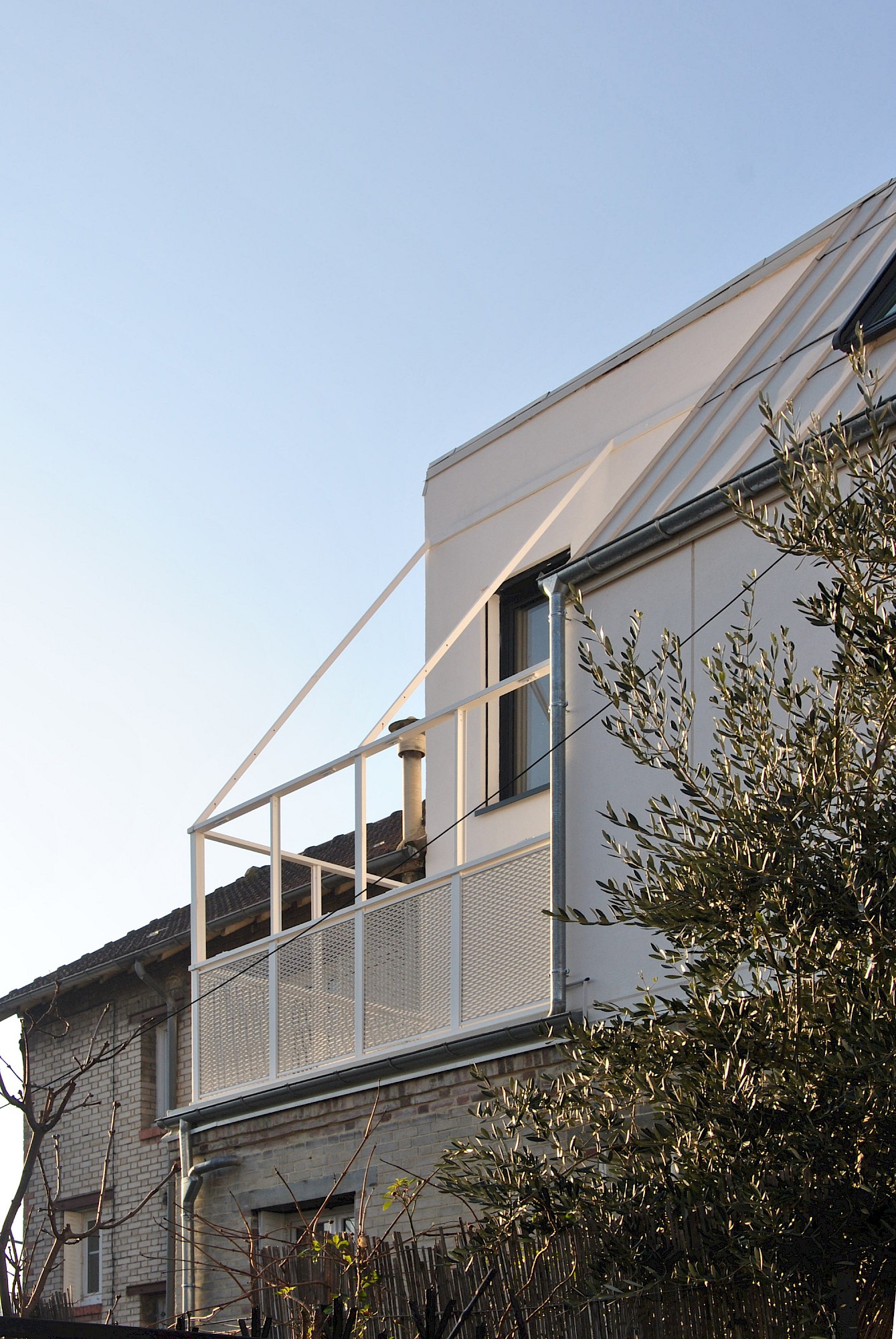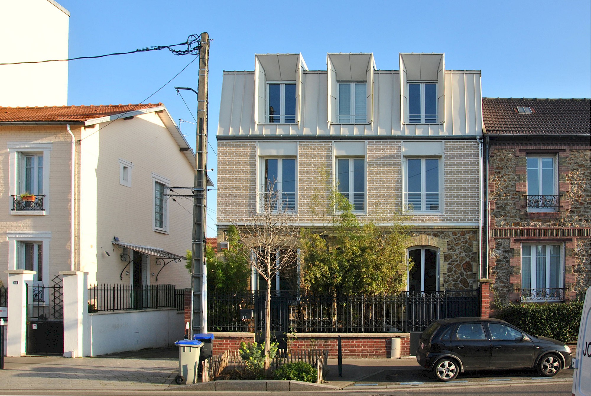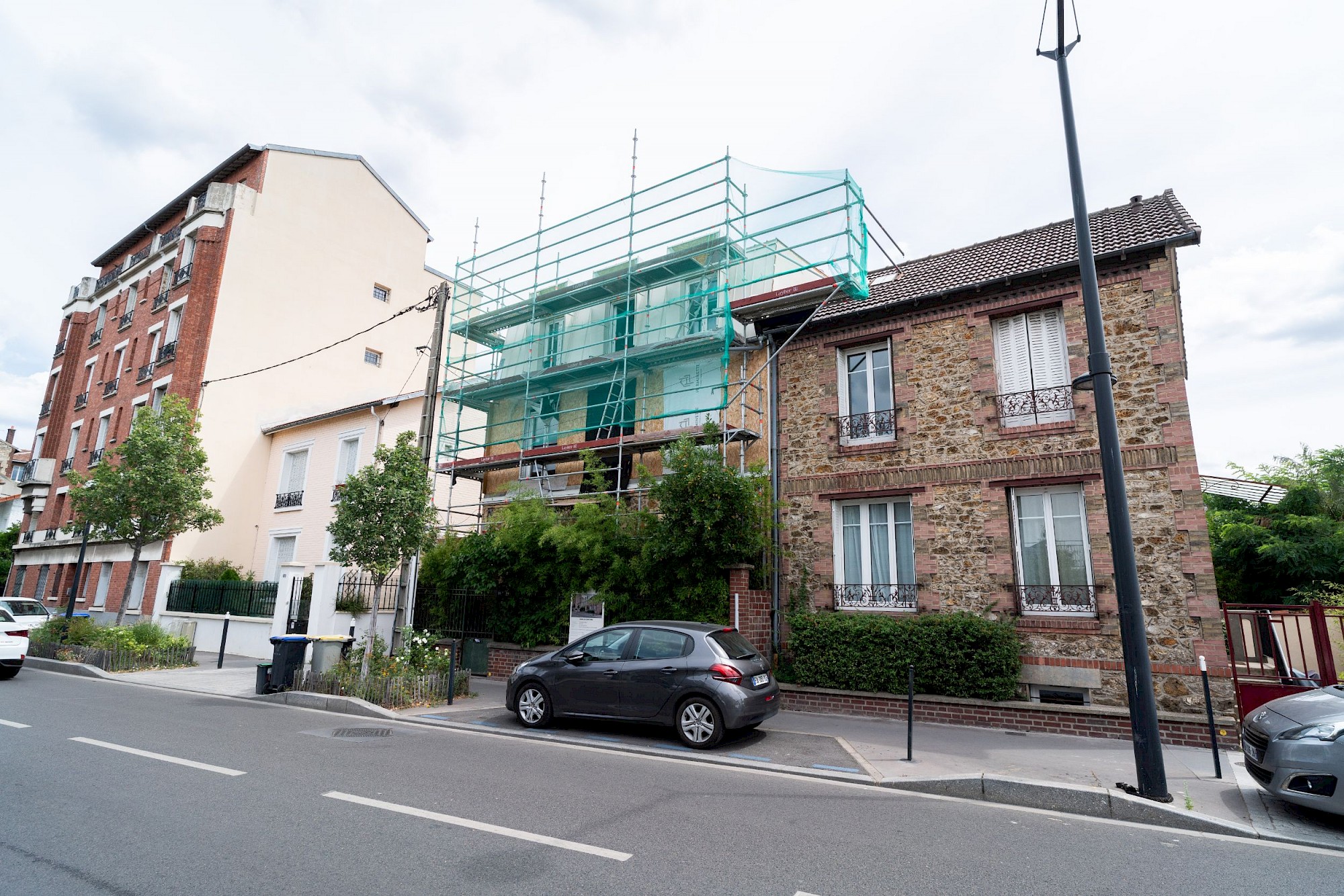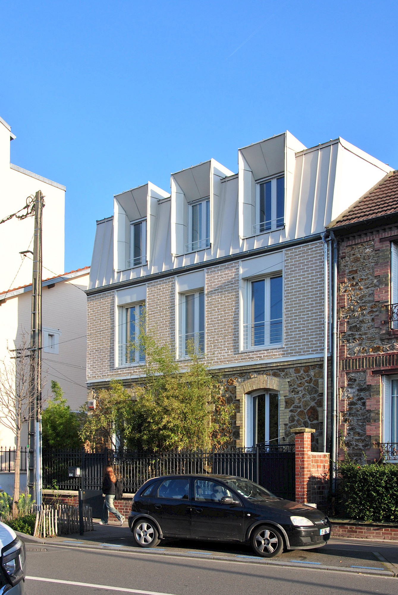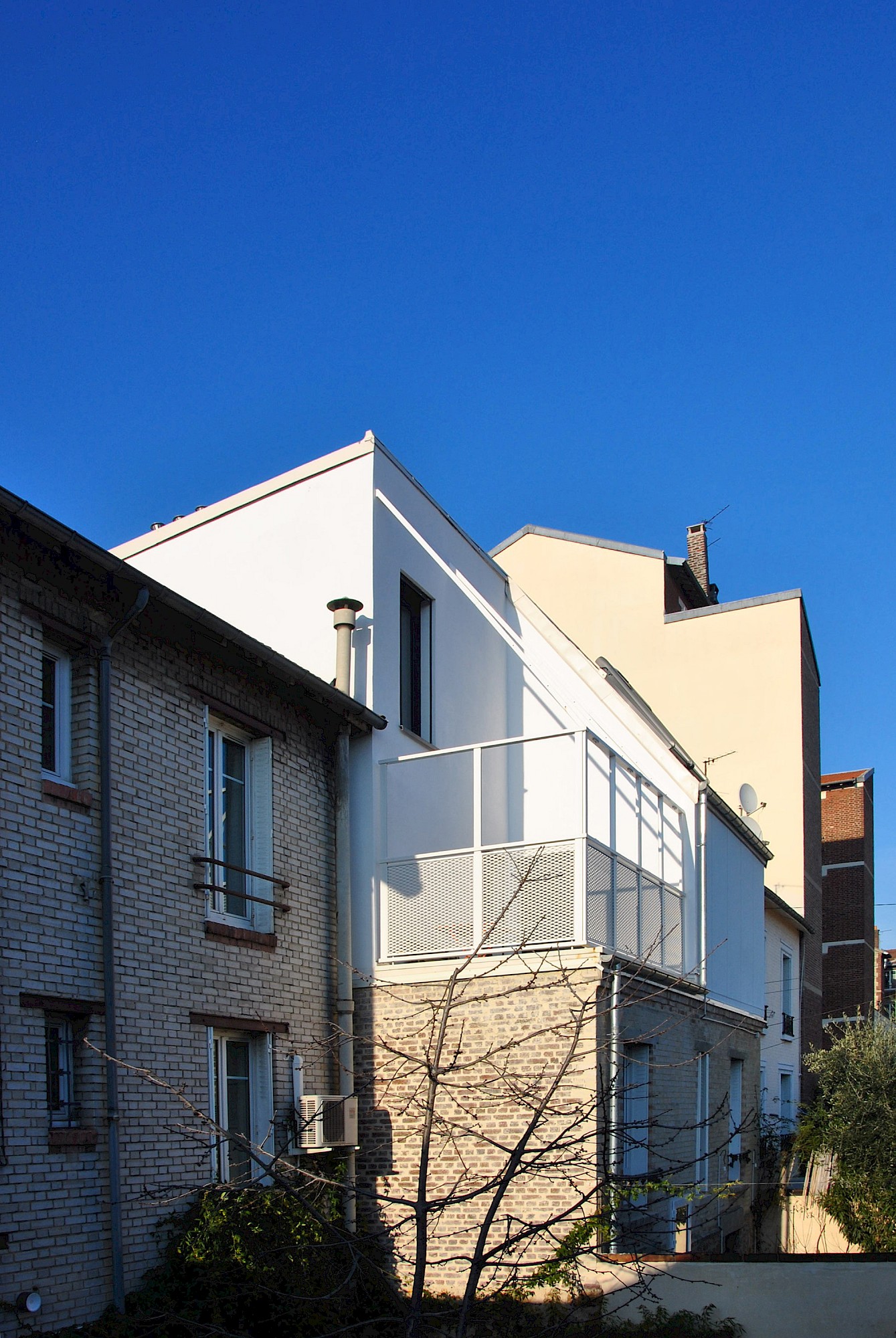 Surélévation sur deux niveaux d’une maison de ville, Restructuration et rénovation du RDC, Reprises structurelles dans l’existant (sur deux niveaux). Construction bois et isolations biosourcées. Réemploi de briques existantes déposées. Chantier partiellement en milieu occupé.____ Dans un contexte urbain, une maison en brique et meulière (début XX) cachée par des bambous, comptait deux niveaux : un rez-de-chaussée habitable et une cave en rez-de-jardin. A l’instar de la famille, la maison doit s’agrandir. Le projet la surélève sur deux niveaux de plus. La maison étant de facture modeste et dans un contexte dense, le bois s’impose pour sa légèreté et facilité de mise en œuvre. La ville, classiciste, souhaite préserver l’aspect minéral de la ville : construire en bois est un vrai défi. S’il est invisible en façades, il se déploiera de manière intimiste dans la maison. Le projet reprend les matérialités et alignements voisins. La dominance du blanc limite les contrastes visuels et l’effet d’ilot de chaleur urbain. L’arrière de la maison se joue des règles du PLU pour créer une volumétrie plus contemporaine et une terrasse au soleil (avec une ossature pour plantes grimpantes). La surélévation est isolée en laine de bois (intérieur) et panneaux de fibre de bois (pare-pluie extérieur). Isolation, ouvertures généreuses et balayage d’air horizontal et vertical, assurent un confort d’usage en toute saisons avec peu d’apport de chauffe ou de rafraichissement. La maisonnette fait office de socle. Elle est renforcée par un portique central auto-fondé qui la décharge et a permis d’éviter des reprises de fondations. Les deux nouveaux niveaux s’élèvent en structure bois : ossature poteaux-poutres, murs, planchers, plafonds, charpente, escaliers.