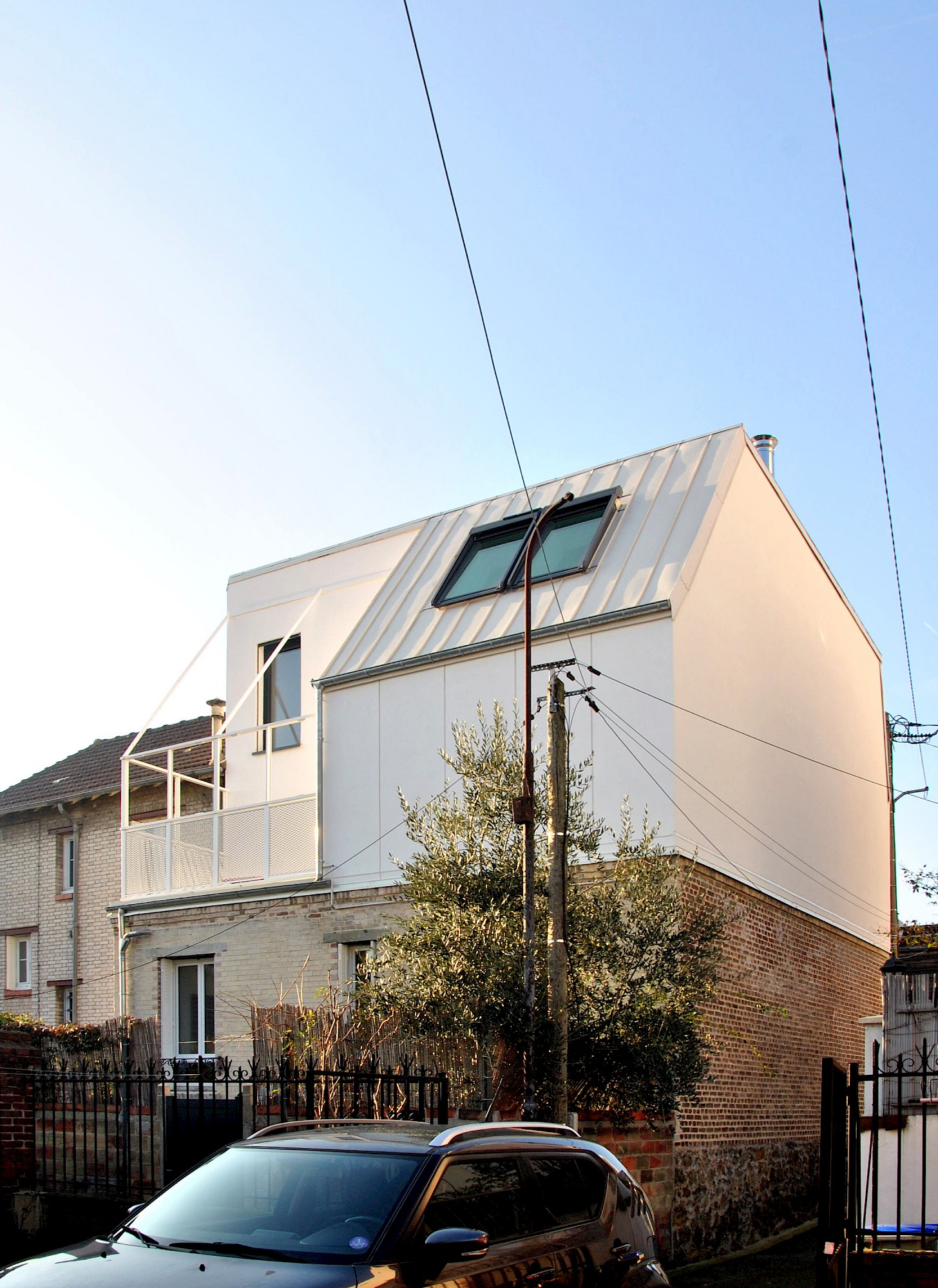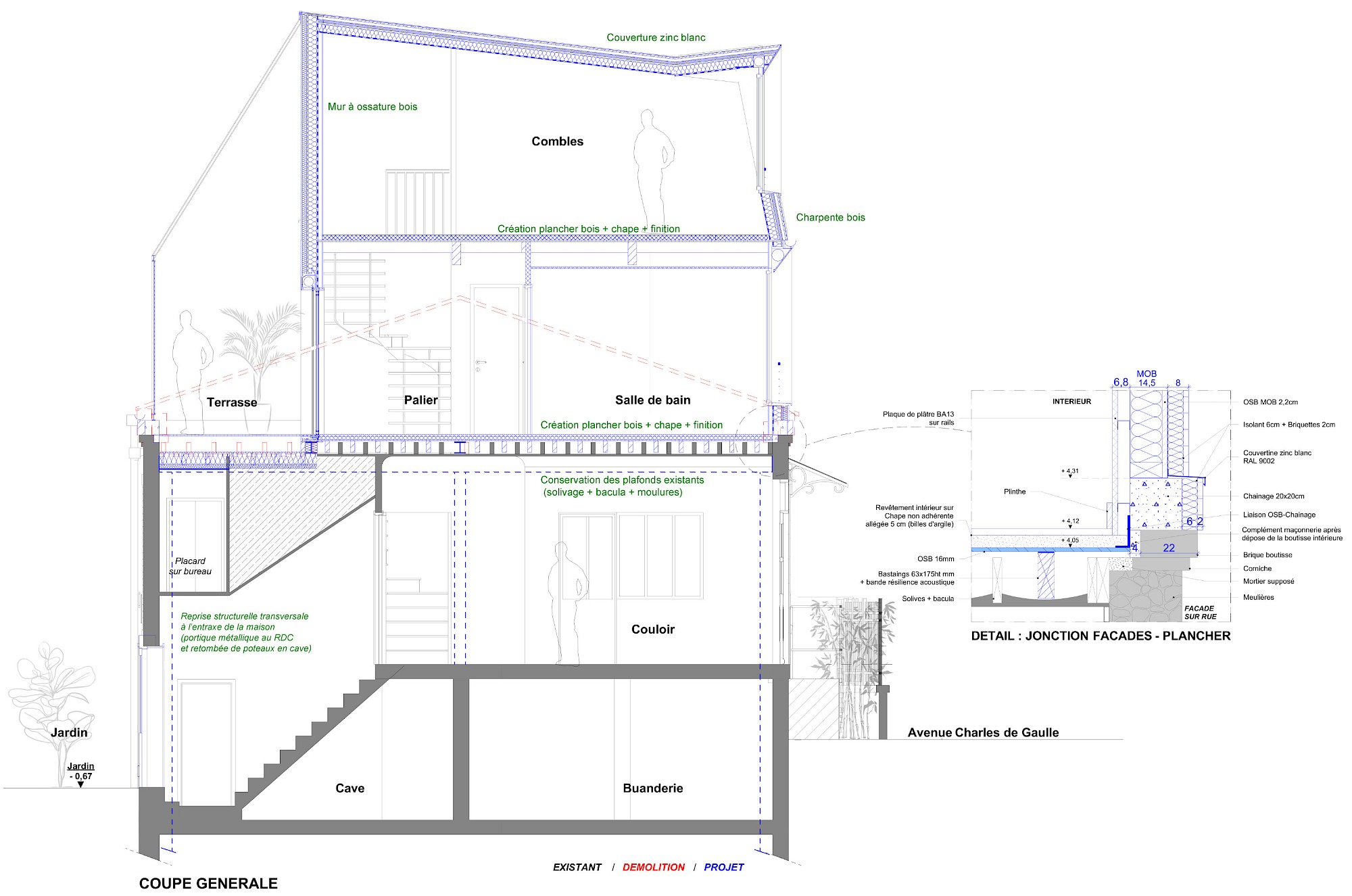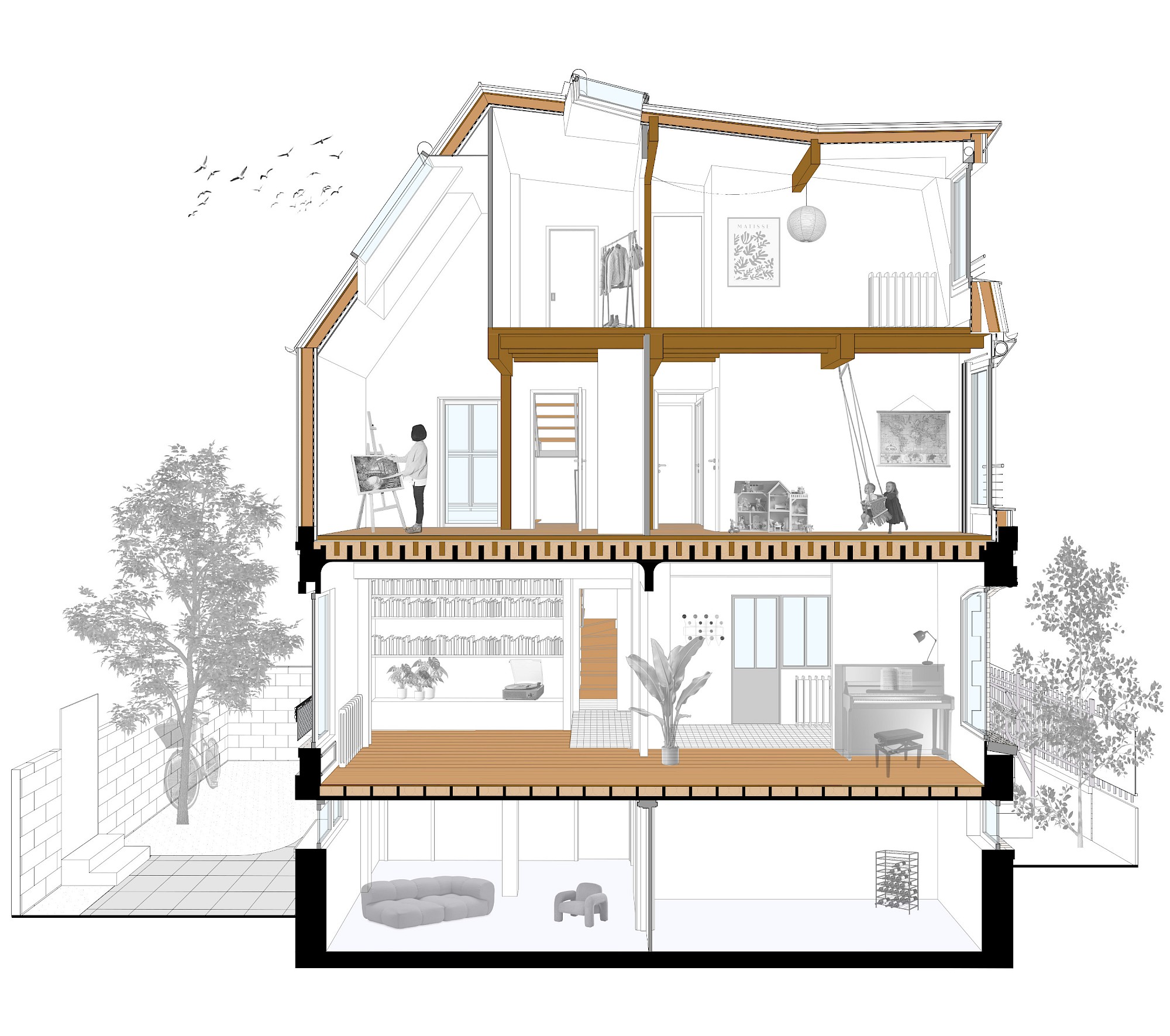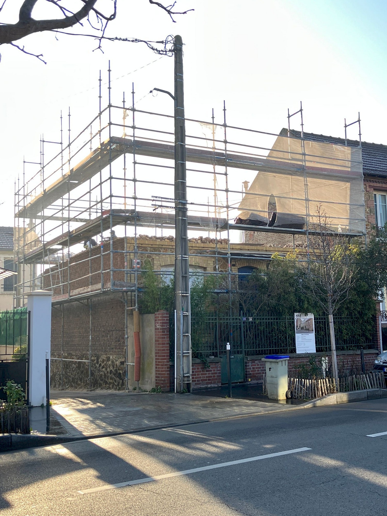 Surélévation sur deux niveaux d’une maison de ville, Restructuration et rénovation du RDC, Reprises structurelles dans l’existant (sur deux niveaux). Construction bois et isolations biosourcées. Réemploi de briques existantes déposées. Chantier partiellement en milieu occupé.____ Dans un contexte urbain, une maison en brique et meulière (début XX) cachée par des bambous, comptait deux niveaux : un rez-de-chaussée habitable et une cave en rez-de-jardin. A l’instar de la famille, la maison doit s’agrandir. Le projet la surélève sur deux niveaux de plus. La maison étant de facture modeste et dans un contexte dense, le bois s’impose pour sa légèreté et facilité de mise en œuvre. La ville, classiciste, souhaite préserver l’aspect minéral de la ville : construire en bois est un vrai défi. S’il est invisible en façades, il se déploiera de manière intimiste dans la maison. Le projet reprend les matérialités et alignements voisins. La dominance du blanc limite les contrastes visuels et l’effet d’ilot de chaleur urbain. L’arrière de la maison se joue des règles du PLU pour créer une volumétrie plus contemporaine et une terrasse au soleil (avec une ossature pour plantes grimpantes). La surélévation est isolée en laine de bois (intérieur) et panneaux de fibre de bois (pare-pluie extérieur). Isolation, ouvertures généreuses et balayage d’air horizontal et vertical, assurent un confort d’usage en toute saisons avec peu d’apport de chauffe ou de rafraichissement. La maisonnette fait office de socle. Elle est renforcée par un portique central auto-fondé qui la décharge et a permis d’éviter des reprises de fondations. Les deux nouveaux niveaux s’élèvent en structure bois : ossature poteaux-poutres, murs, planchers, plafonds, charpente, escaliers.