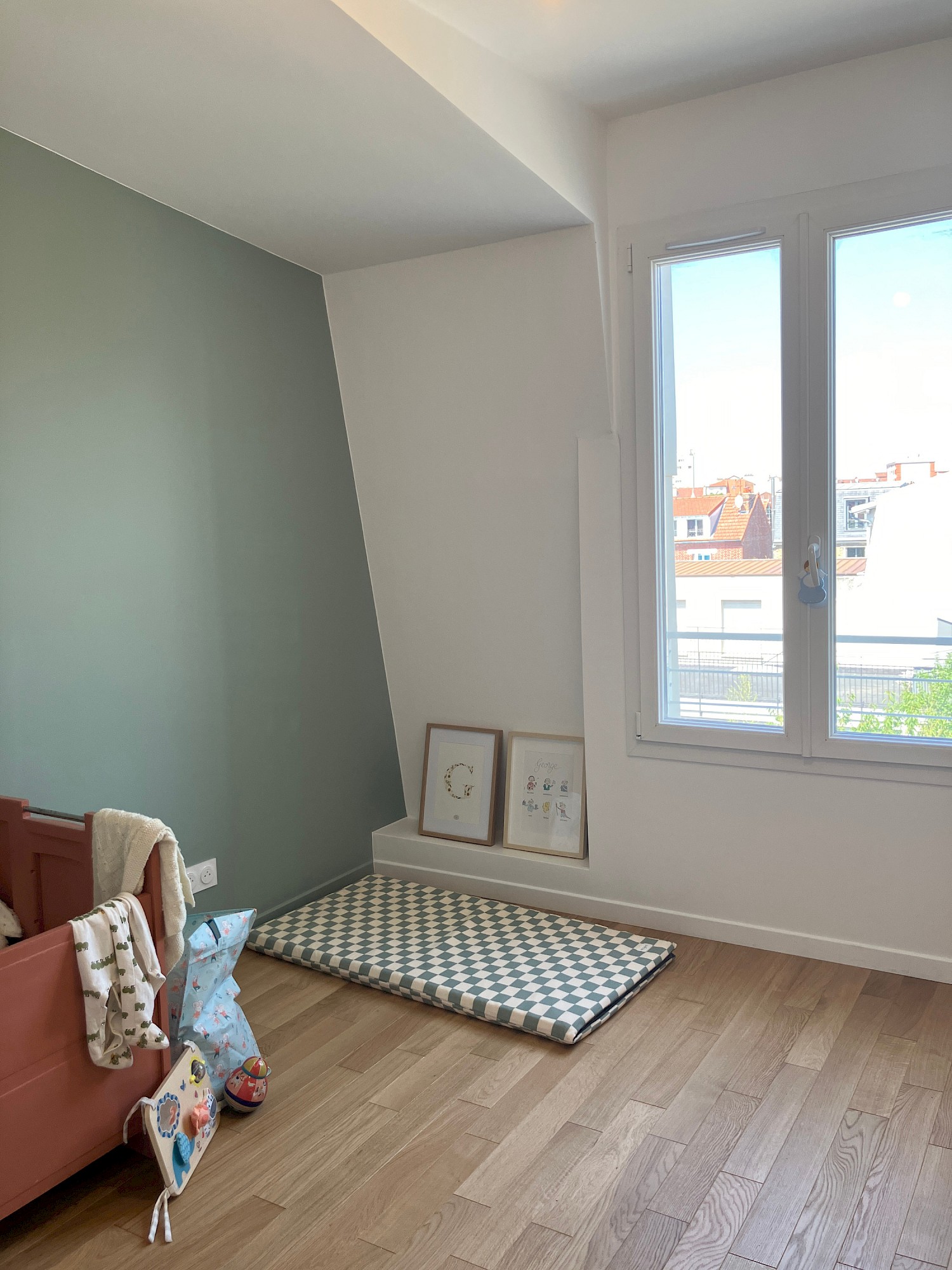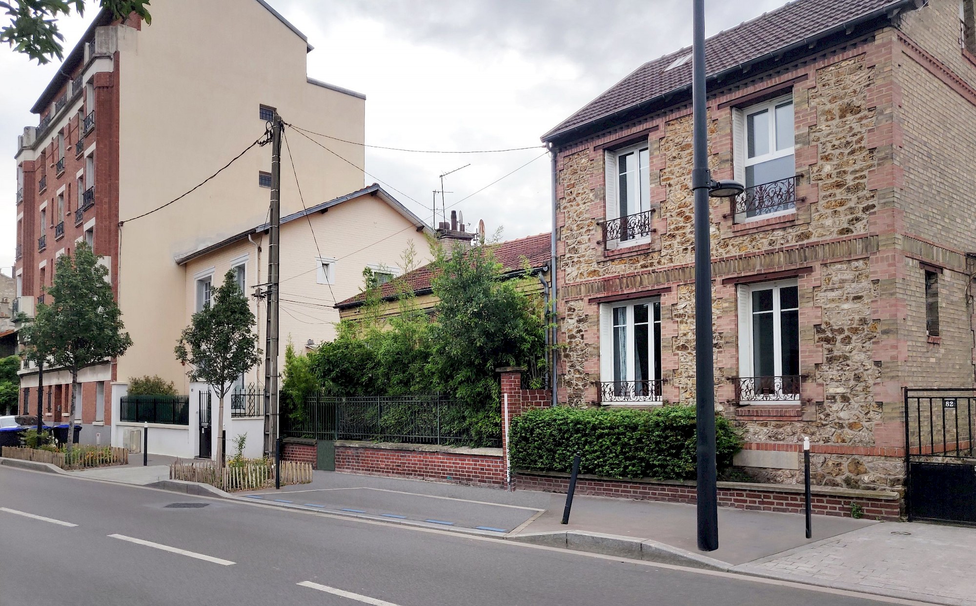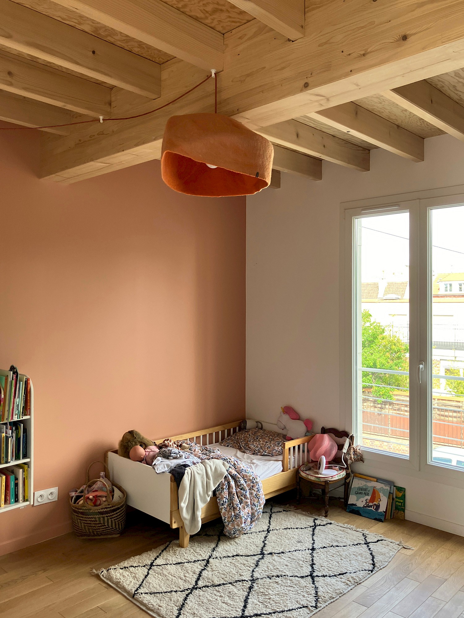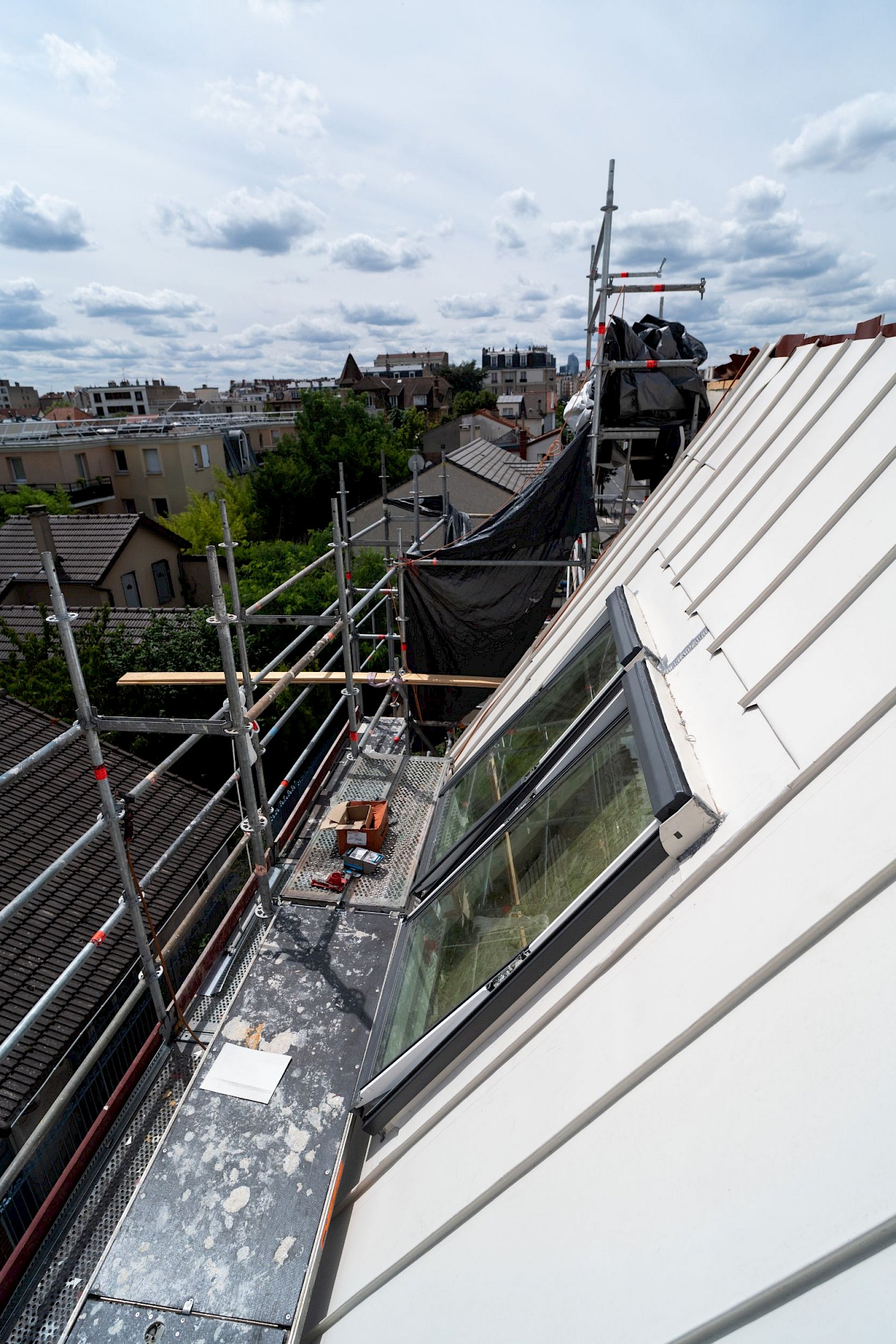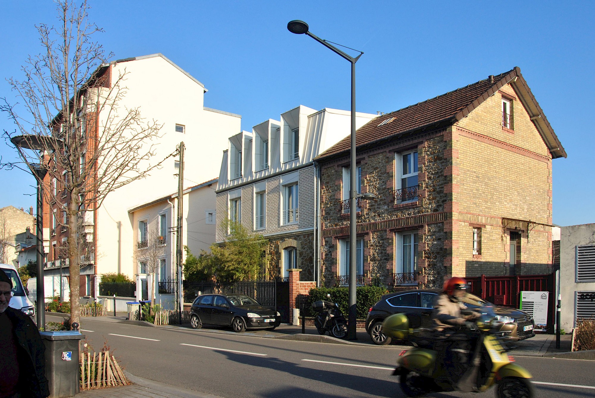 Surélévation sur deux niveaux d’une maison de ville, Restructuration et rénovation du RDC, Reprises structurelles dans l’existant (sur deux niveaux). Construction bois et isolations biosourcées. Réemploi de briques existantes déposées. Chantier partiellement en milieu occupé.____ Dans un contexte urbain, une maison en brique et meulière (début XX) cachée par des bambous, comptait deux niveaux : un rez-de-chaussée habitable et une cave en rez-de-jardin. A l’instar de la famille, la maison doit s’agrandir. Le projet la surélève sur deux niveaux de plus. La maison étant de facture modeste et dans un contexte dense, le bois s’impose pour sa légèreté et facilité de mise en œuvre. La ville, classiciste, souhaite préserver l’aspect minéral de la ville : construire en bois est un vrai défi. S’il est invisible en façades, il se déploiera de manière intimiste dans la maison. Le projet reprend les matérialités et alignements voisins. La dominance du blanc limite les contrastes visuels et l’effet d’ilot de chaleur urbain. L’arrière de la maison se joue des règles du PLU pour créer une volumétrie plus contemporaine et une terrasse au soleil (avec une ossature pour plantes grimpantes). La surélévation est isolée en laine de bois (intérieur) et panneaux de fibre de bois (pare-pluie extérieur). Isolation, ouvertures généreuses et balayage d’air horizontal et vertical, assurent un confort d’usage en toute saisons avec peu d’apport de chauffe ou de rafraichissement. La maisonnette fait office de socle. Elle est renforcée par un portique central auto-fondé qui la décharge et a permis d’éviter des reprises de fondations. Les deux nouveaux niveaux s’élèvent en structure bois : ossature poteaux-poutres, murs, planchers, plafonds, charpente, escaliers.