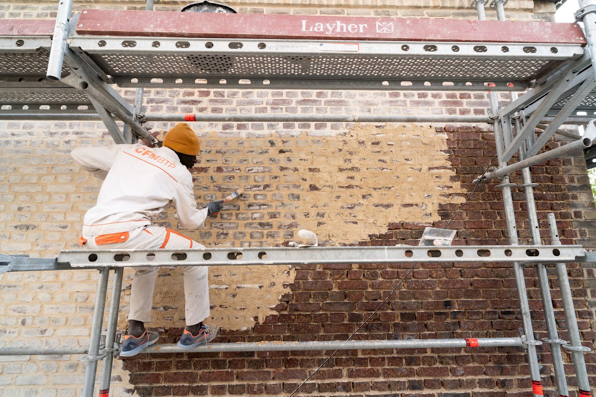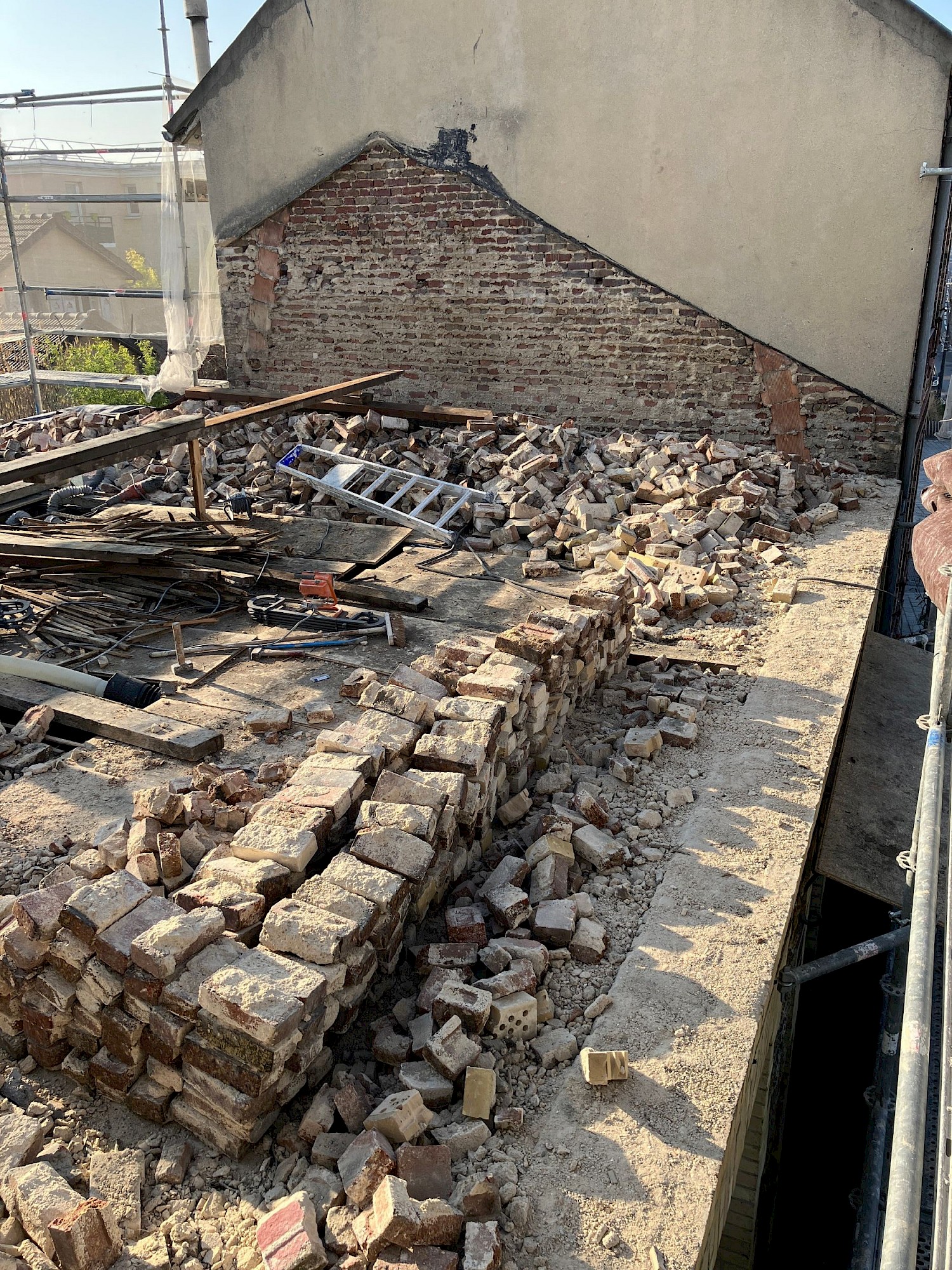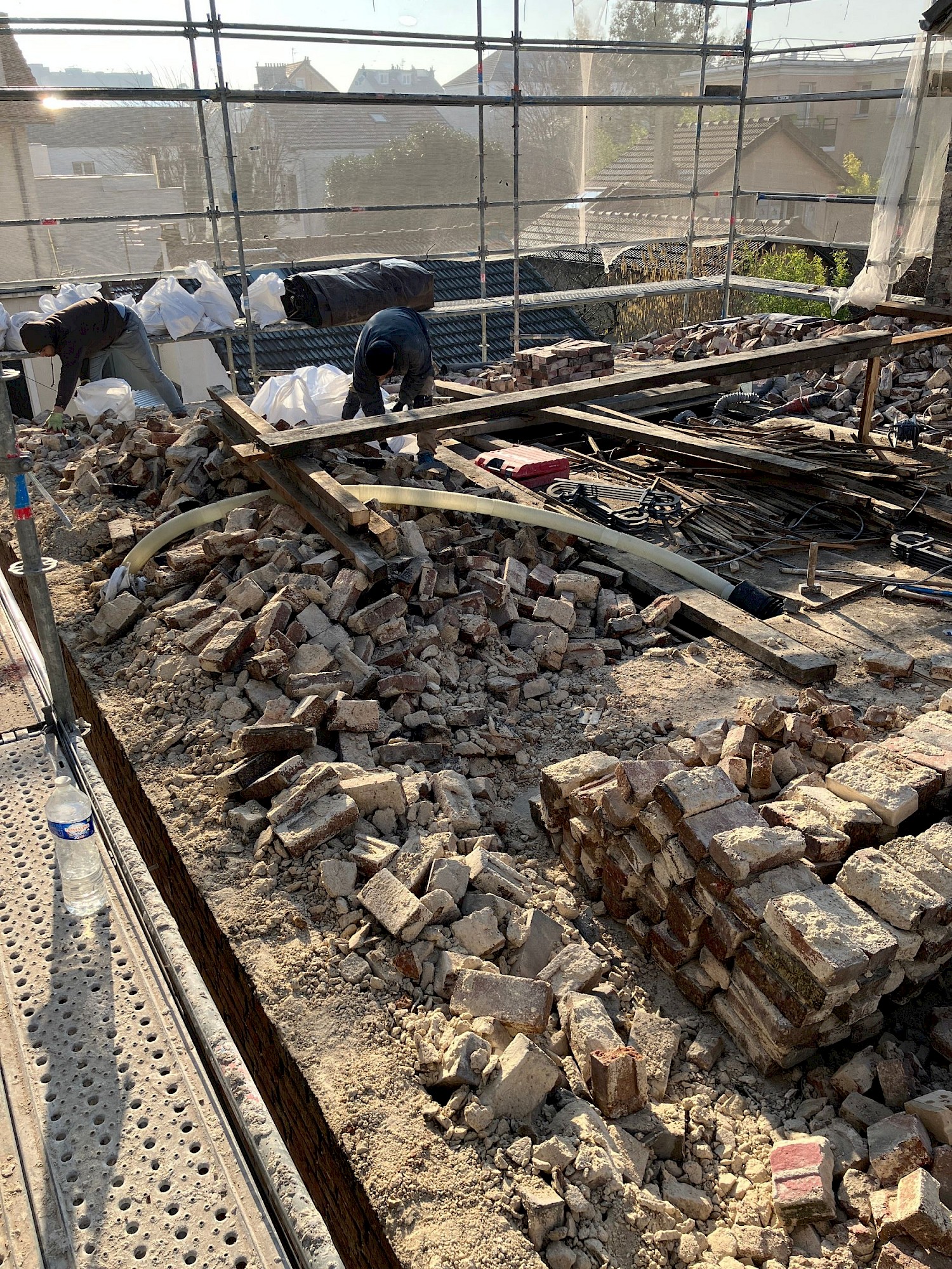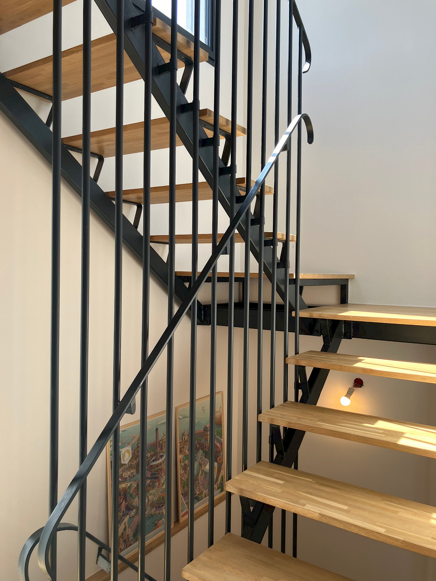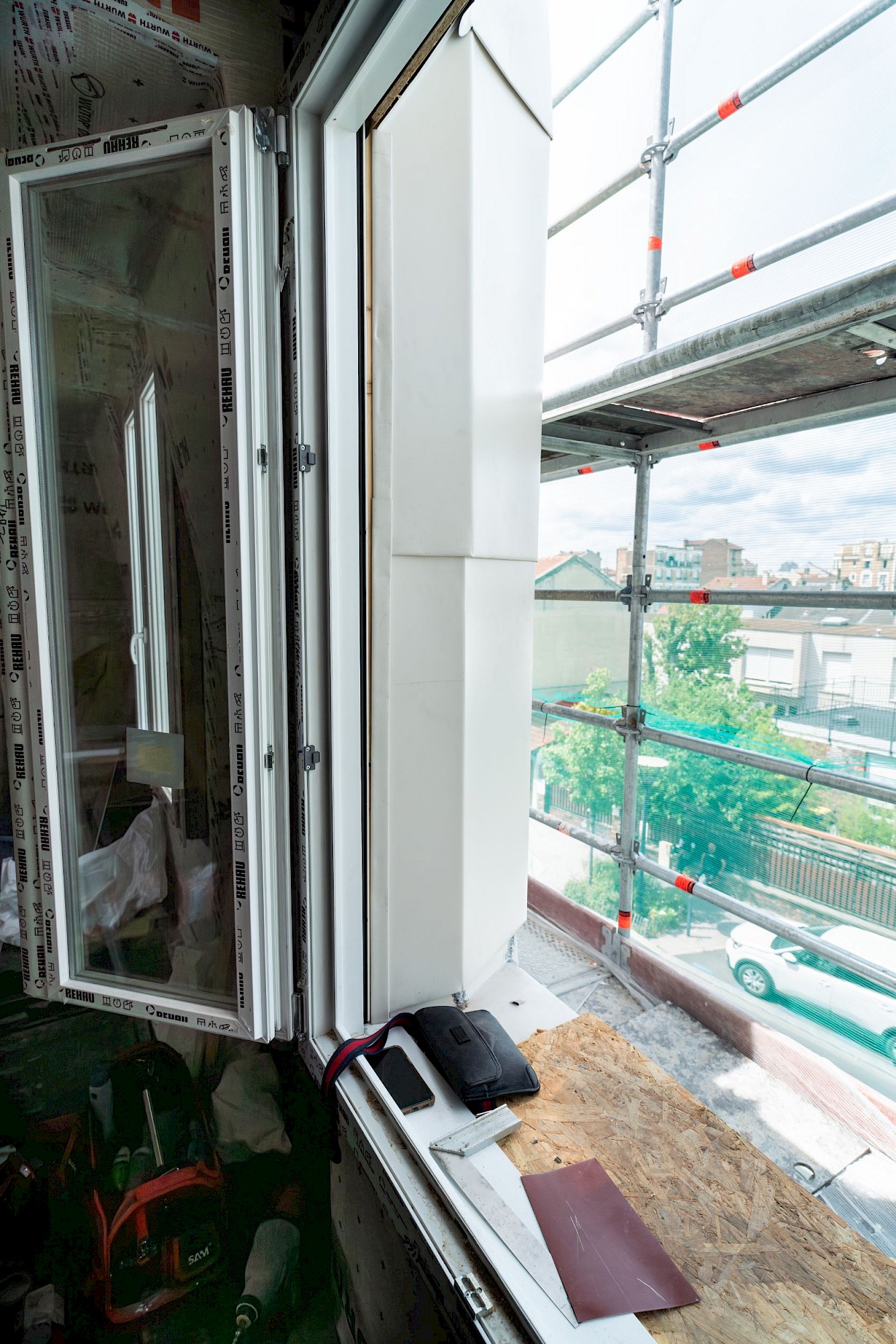 Surélévation sur deux niveaux d’une maison de ville, Restructuration et rénovation du RDC, Reprises structurelles dans l’existant (sur deux niveaux). Construction bois et isolations biosourcées. Réemploi de briques existantes déposées. Chantier partiellement en milieu occupé.____ Dans un contexte urbain, une maison en brique et meulière (début XX) cachée par des bambous, comptait deux niveaux : un rez-de-chaussée habitable et une cave en rez-de-jardin. A l’instar de la famille, la maison doit s’agrandir. Le projet la surélève sur deux niveaux de plus. La maison étant de facture modeste et dans un contexte dense, le bois s’impose pour sa légèreté et facilité de mise en œuvre. La ville, classiciste, souhaite préserver l’aspect minéral de la ville : construire en bois est un vrai défi. S’il est invisible en façades, il se déploiera de manière intimiste dans la maison. Le projet reprend les matérialités et alignements voisins. La dominance du blanc limite les contrastes visuels et l’effet d’ilot de chaleur urbain. L’arrière de la maison se joue des règles du PLU pour créer une volumétrie plus contemporaine et une terrasse au soleil (avec une ossature pour plantes grimpantes). La surélévation est isolée en laine de bois (intérieur) et panneaux de fibre de bois (pare-pluie extérieur). Isolation, ouvertures généreuses et balayage d’air horizontal et vertical, assurent un confort d’usage en toute saisons avec peu d’apport de chauffe ou de rafraichissement. La maisonnette fait office de socle. Elle est renforcée par un portique central auto-fondé qui la décharge et a permis d’éviter des reprises de fondations. Les deux nouveaux niveaux s’élèvent en structure bois : ossature poteaux-poutres, murs, planchers, plafonds, charpente, escaliers.
