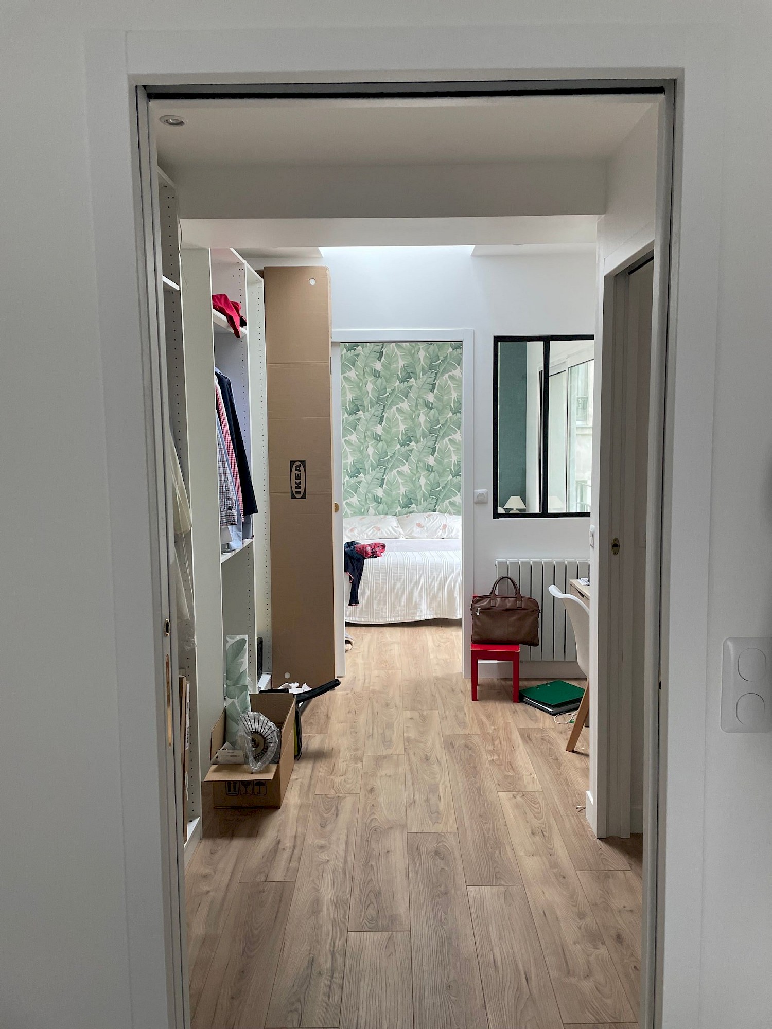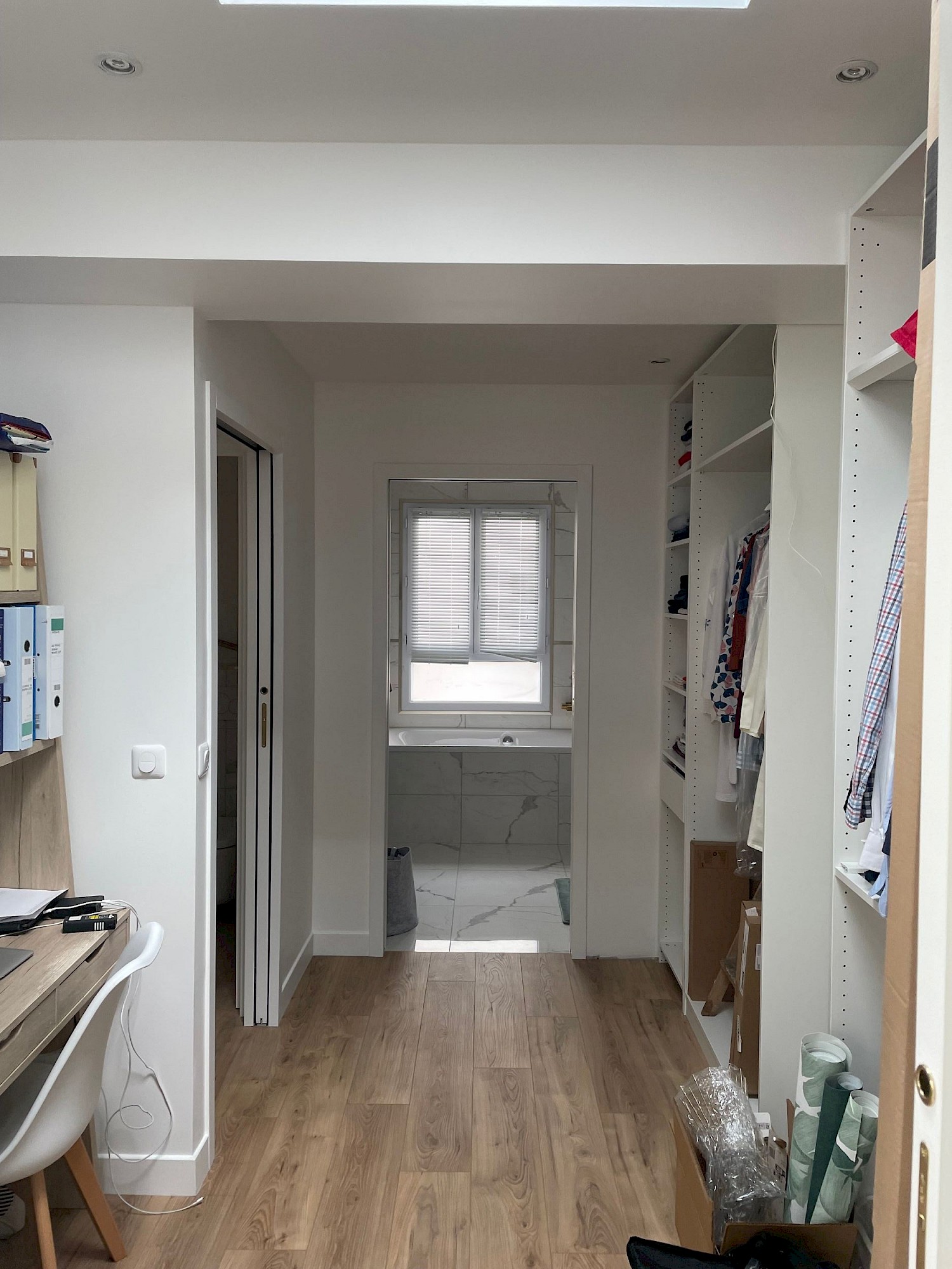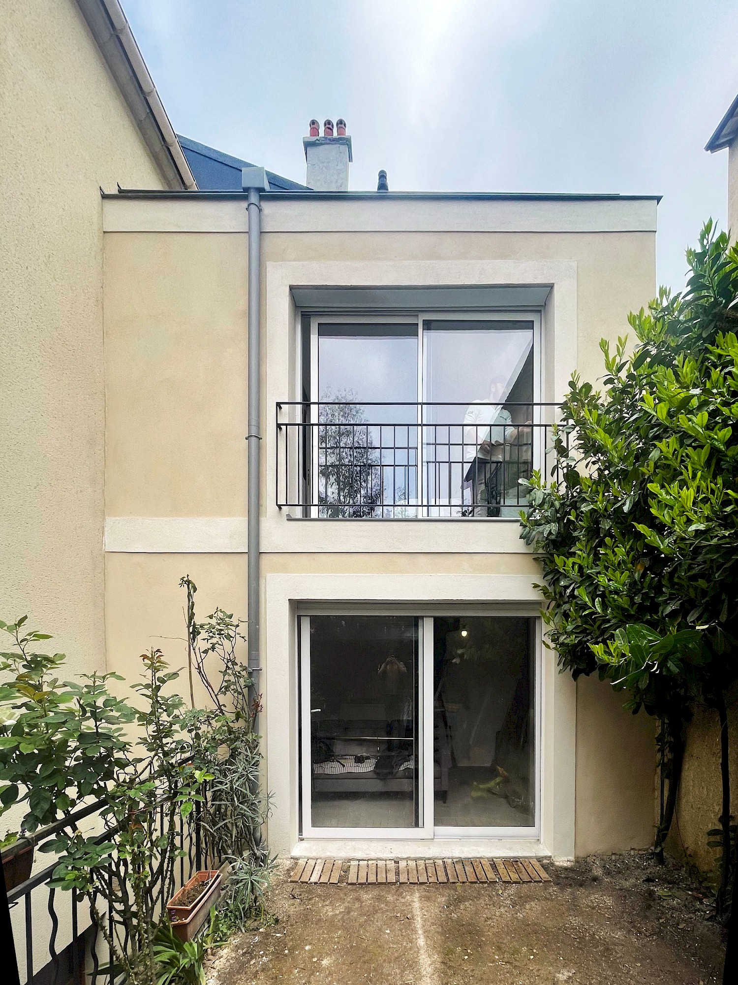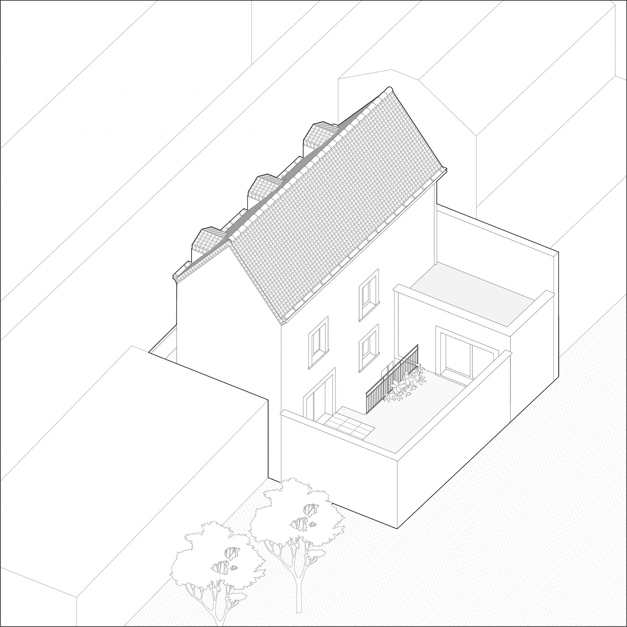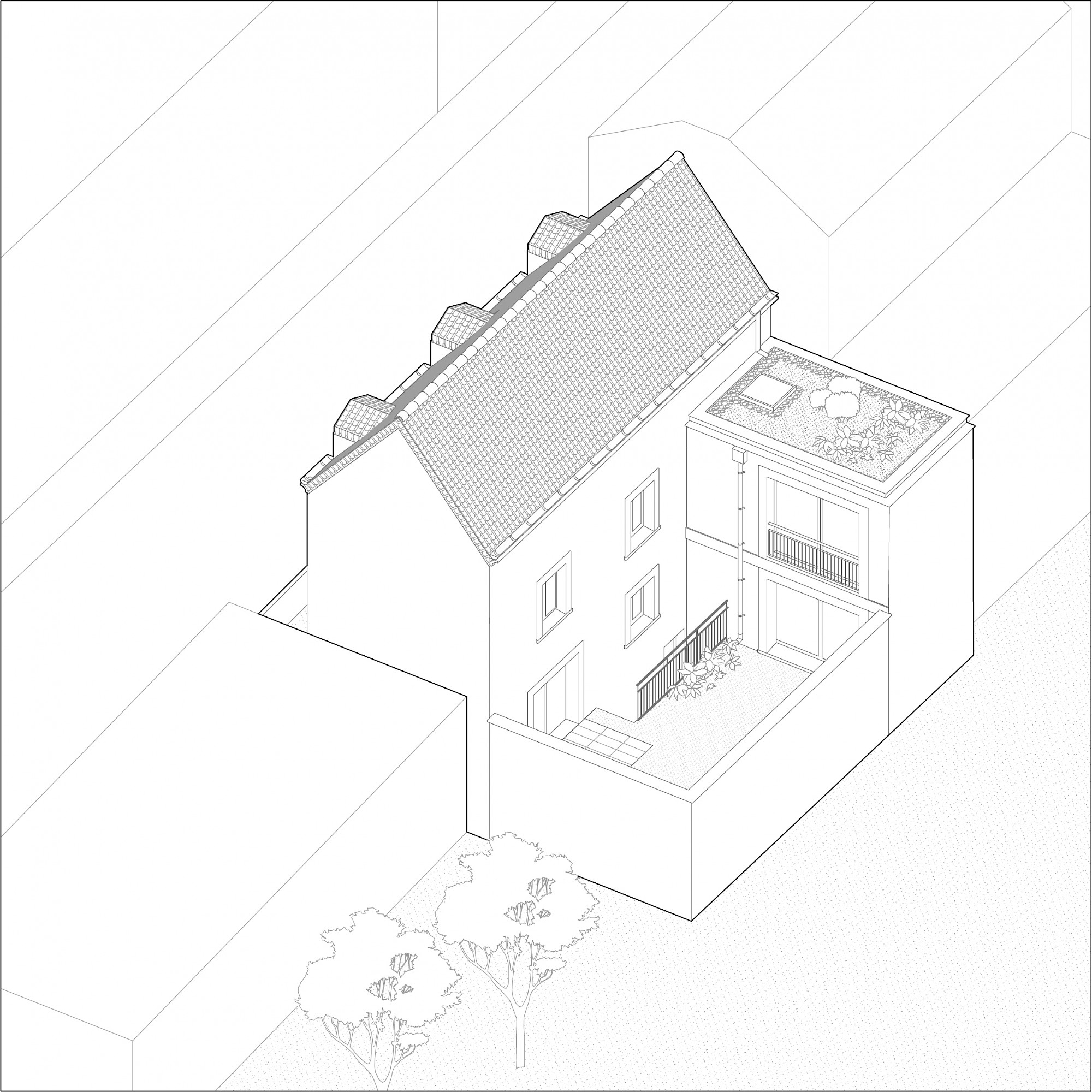 Surélévation et réagencement partiels d’une maison afin de créer une suite parentale. Construction en blocs de béton de chanvre, toiture végétalisée. Chantier en milieu occupé.