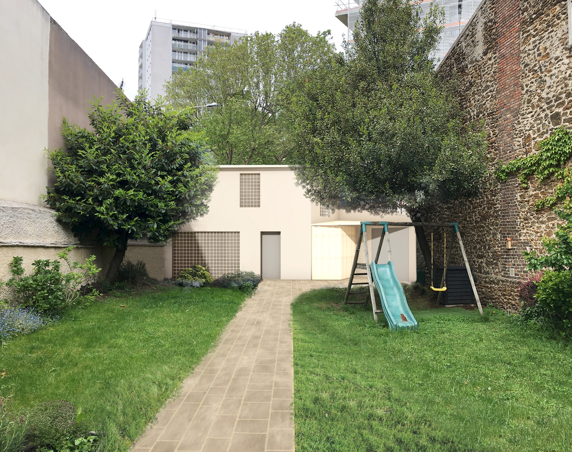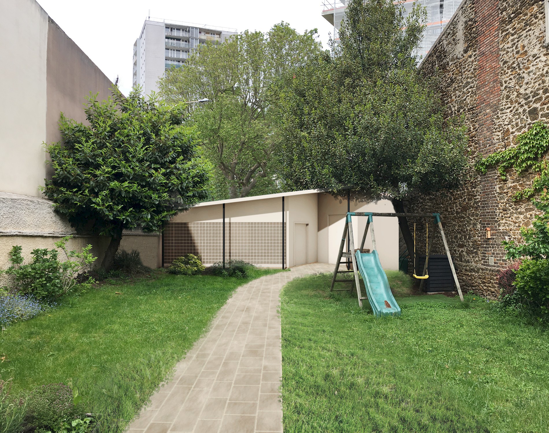Démolition d’un garage et d’une clôture vétustes en vue d’une reconstruction à neuf, pour une meilleure protection physique et acoustique par rapport à la rue. L’étude de faisabilité porte sur deux versions de projets, l’une d’un simple garage et l’autre d’un garage surmonté d’un studio autonome avec son propre accès sur rue.