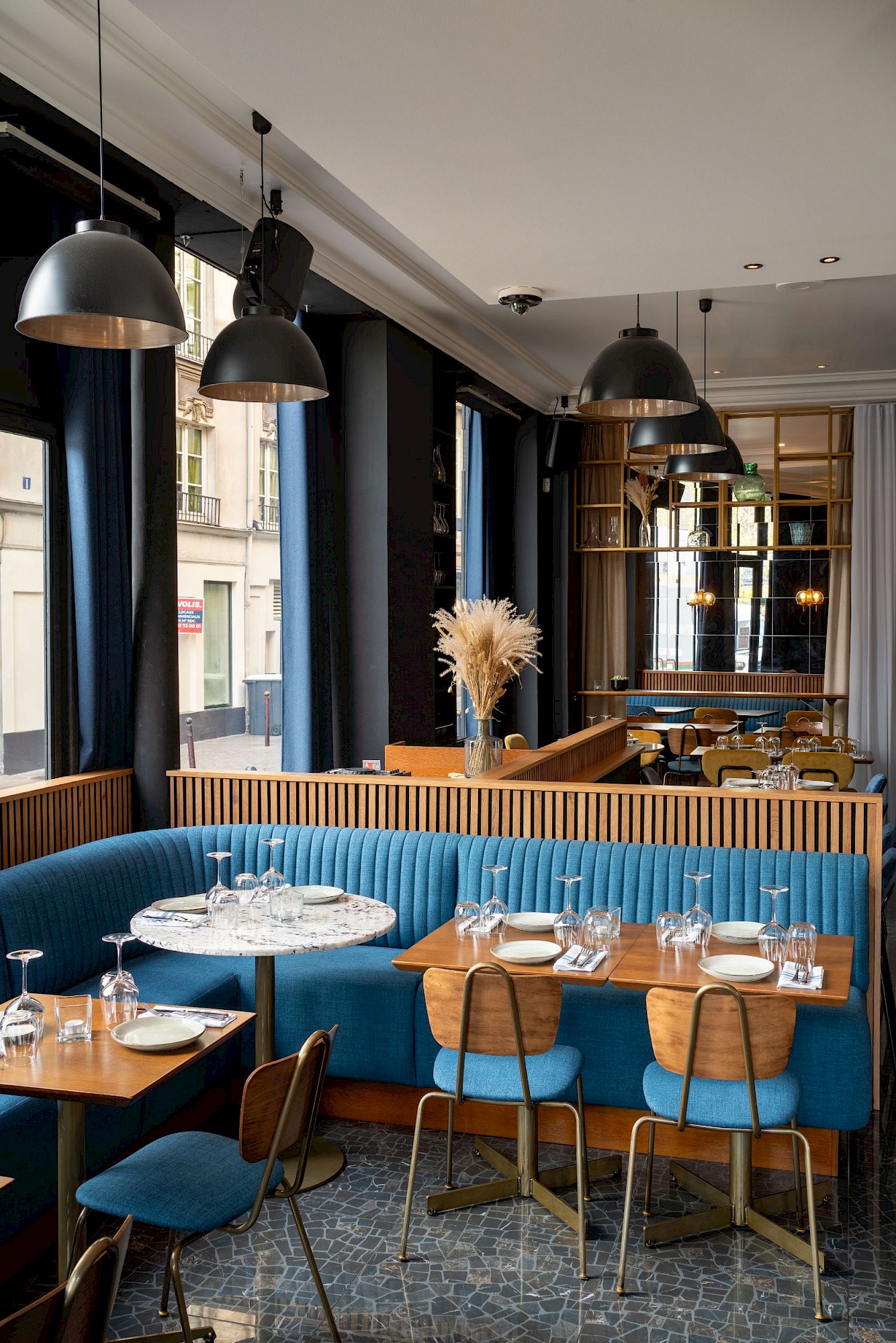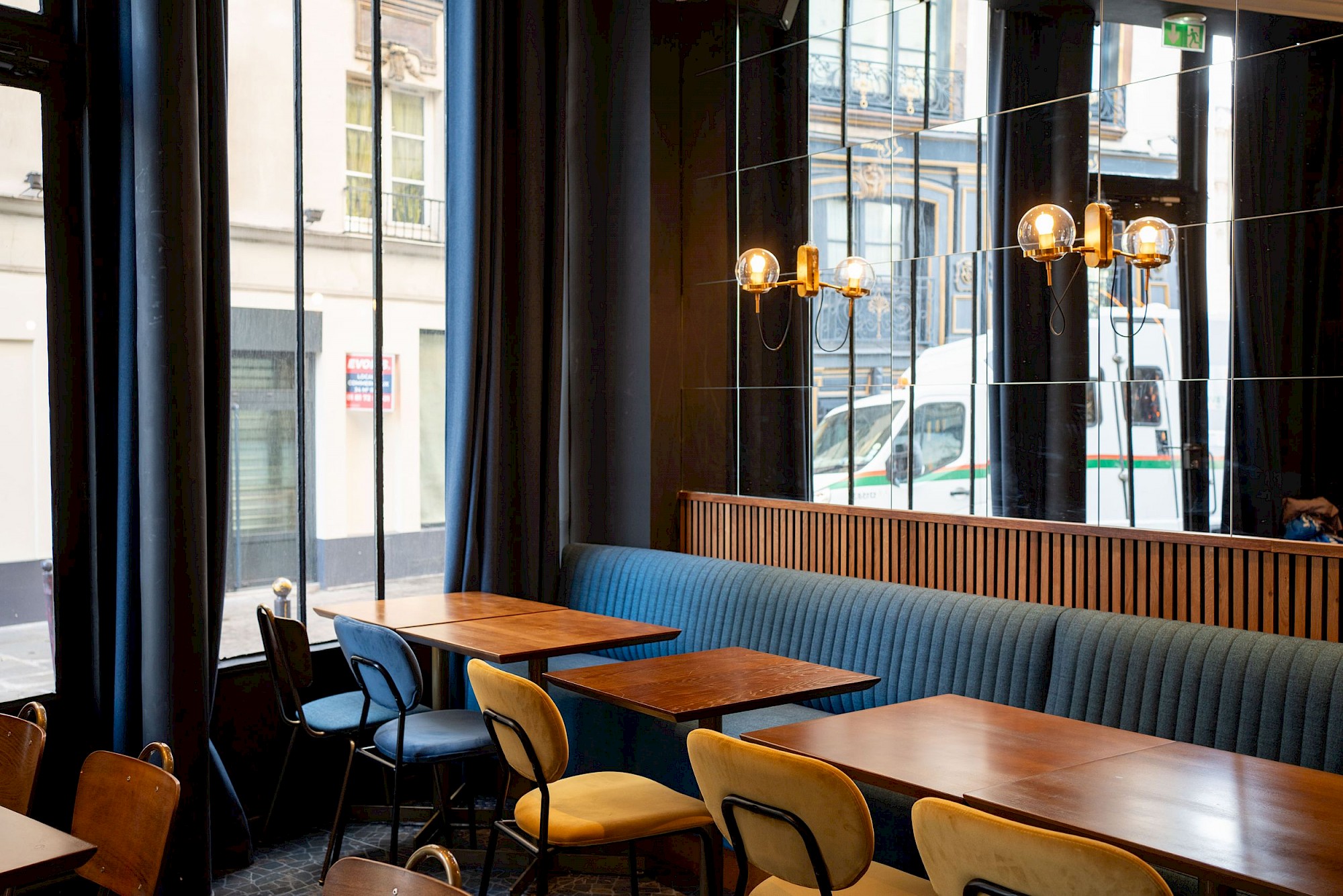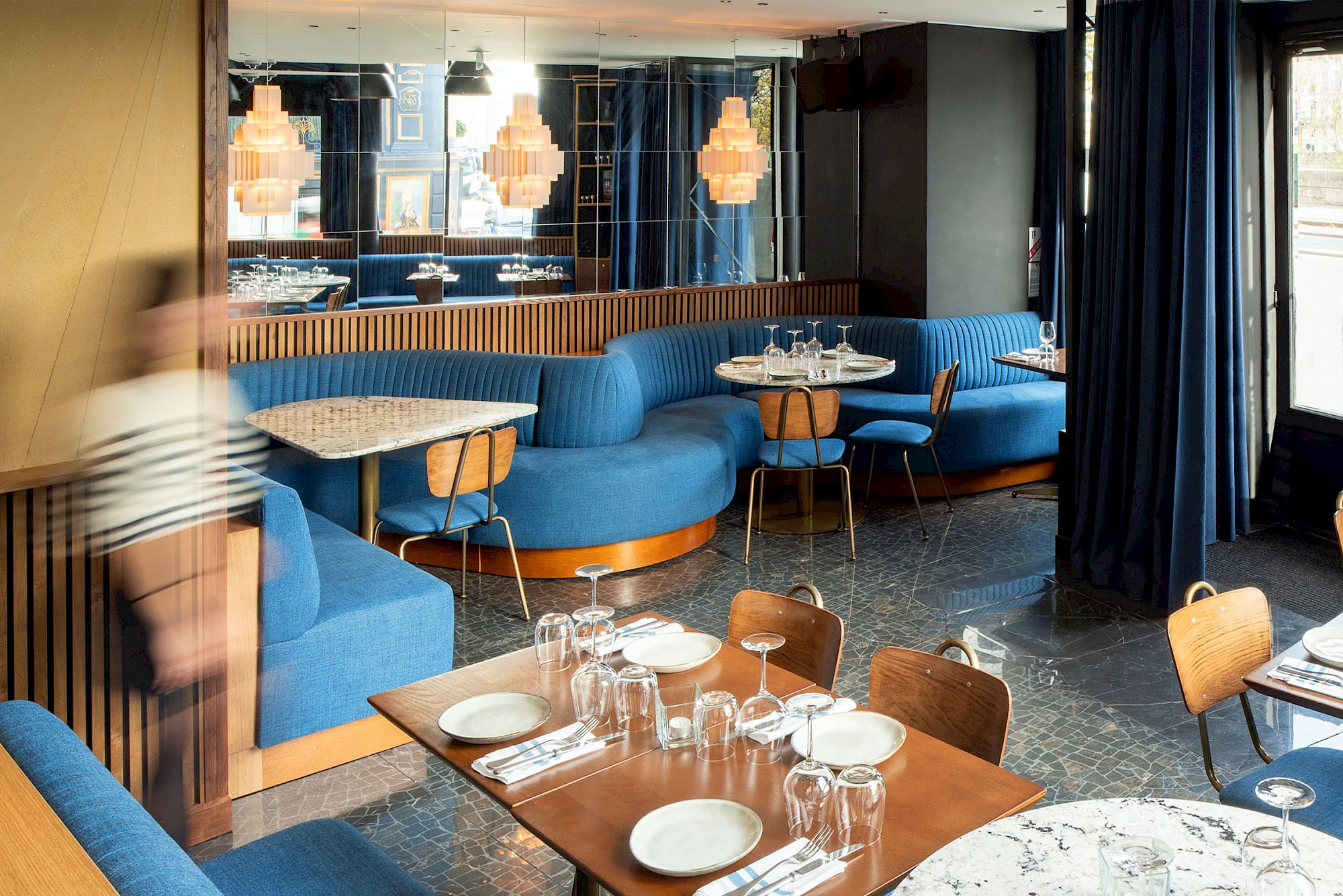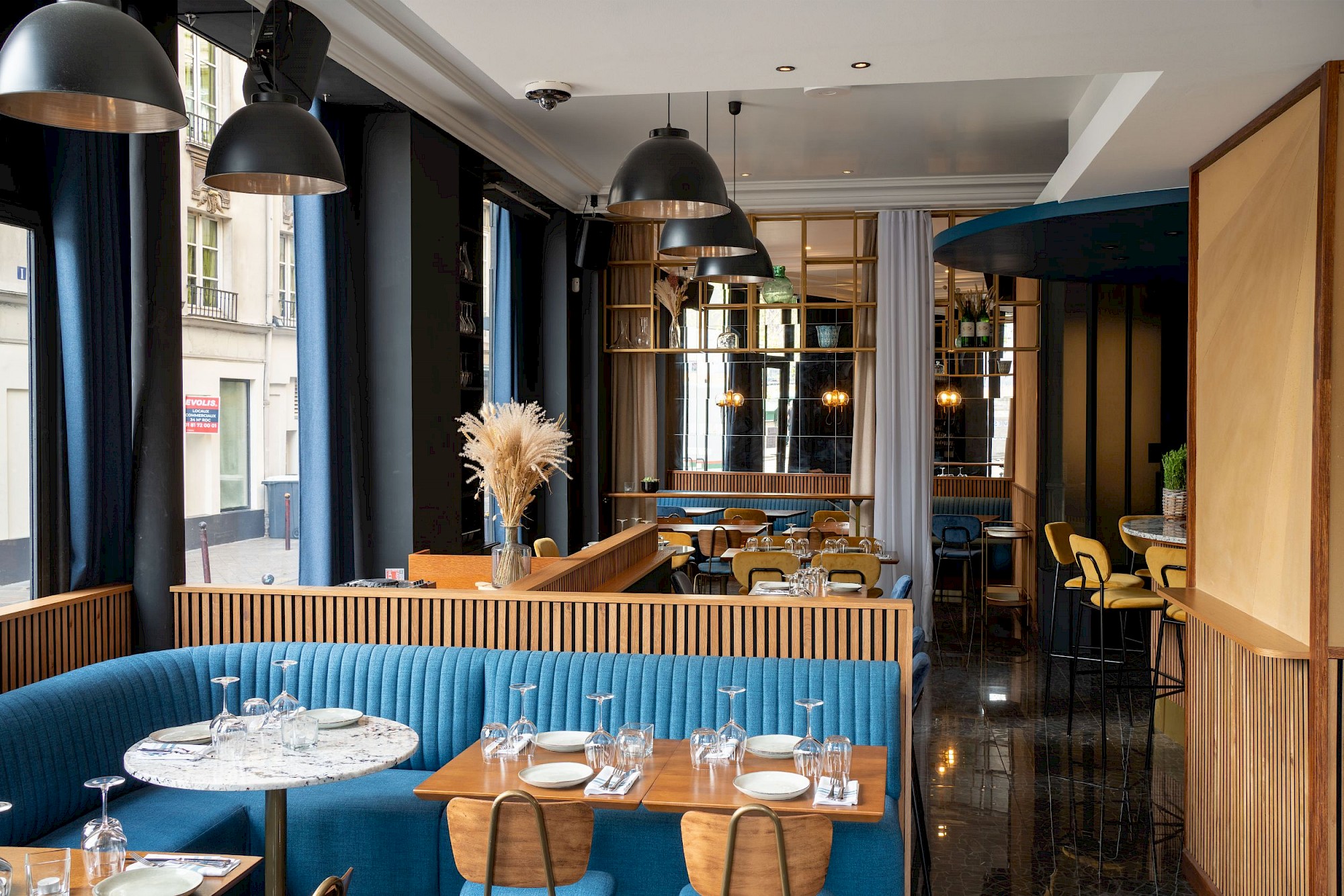 Rénovation d’un restaurant avec agencement sur mesure : Création de serrurerie, menuiserie, tapisserie, tables, banquettes et bar sur mesure. Réemploi de banquettes, tables et chaises existantes (modifiées, rénovées, retapissées). Revêtements muraux enduits de terre du Grand Paris. Lampes en papier réalisées à la main par Antoine Becognée.