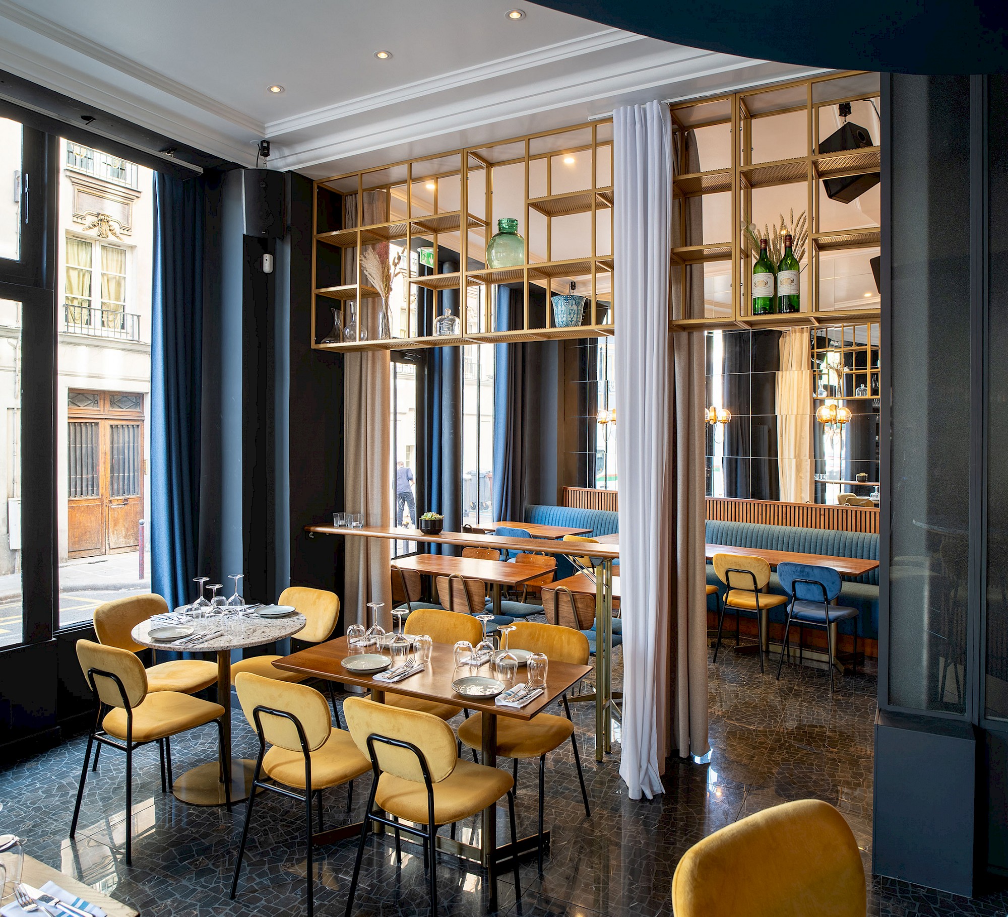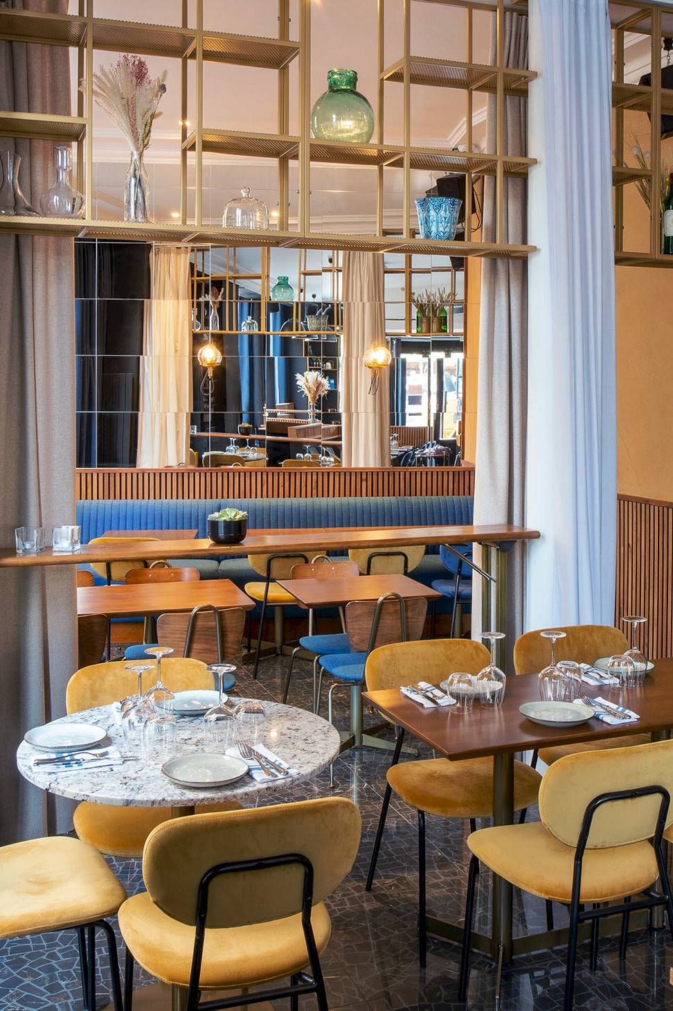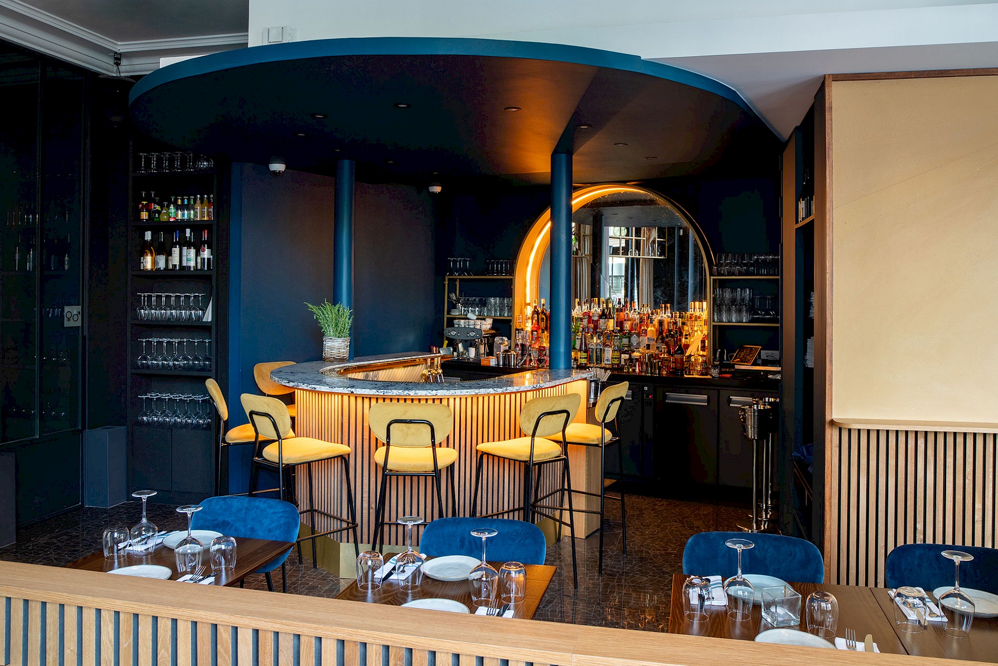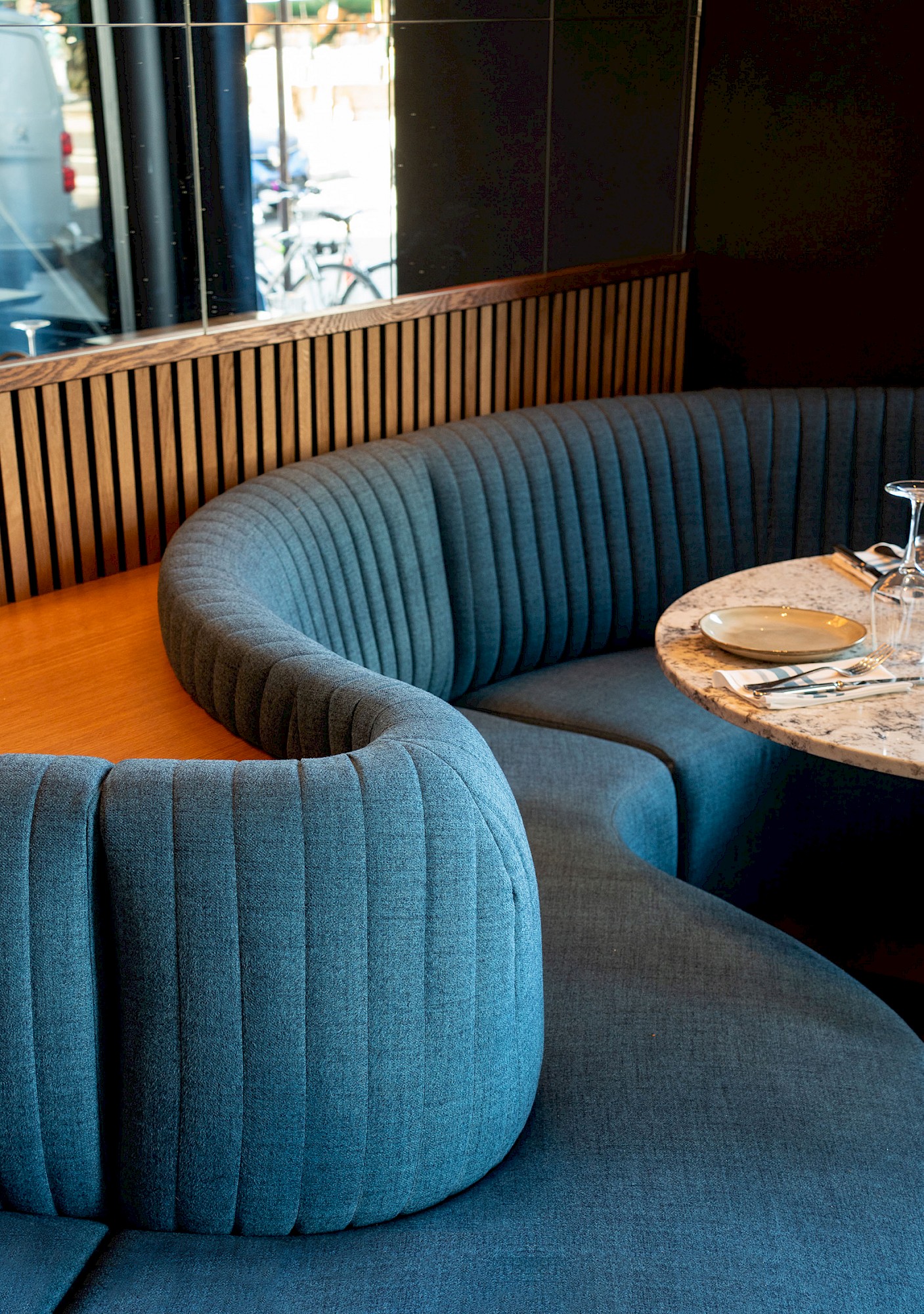 Rénovation d’un restaurant avec agencement sur mesure : Création de serrurerie, menuiserie, tapisserie, tables, banquettes et bar sur mesure. Réemploi de banquettes, tables et chaises existantes (modifiées, rénovées, retapissées). Revêtements muraux enduits de terre du Grand Paris. Lampes en papier réalisées à la main par Antoine Becognée.