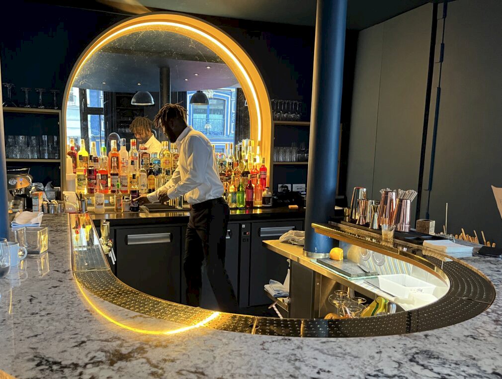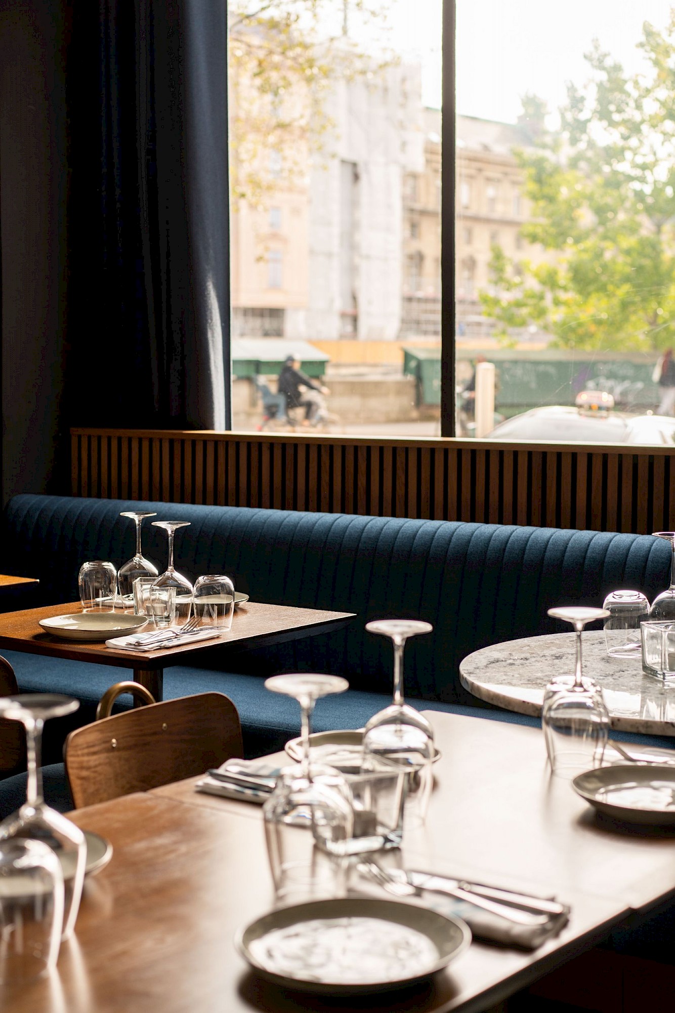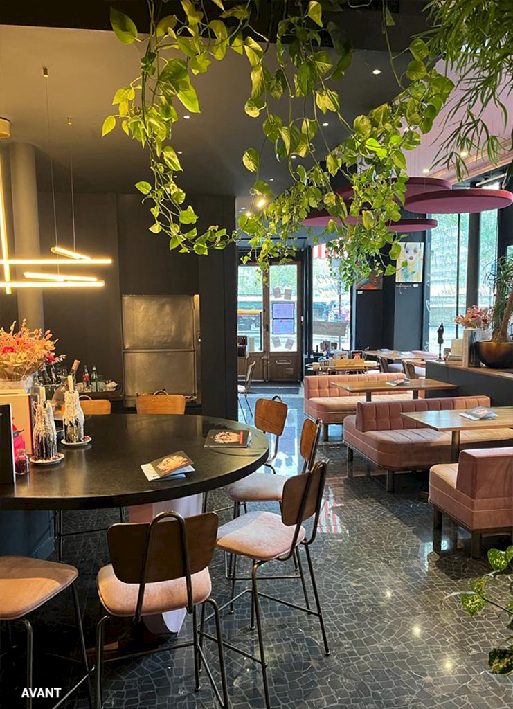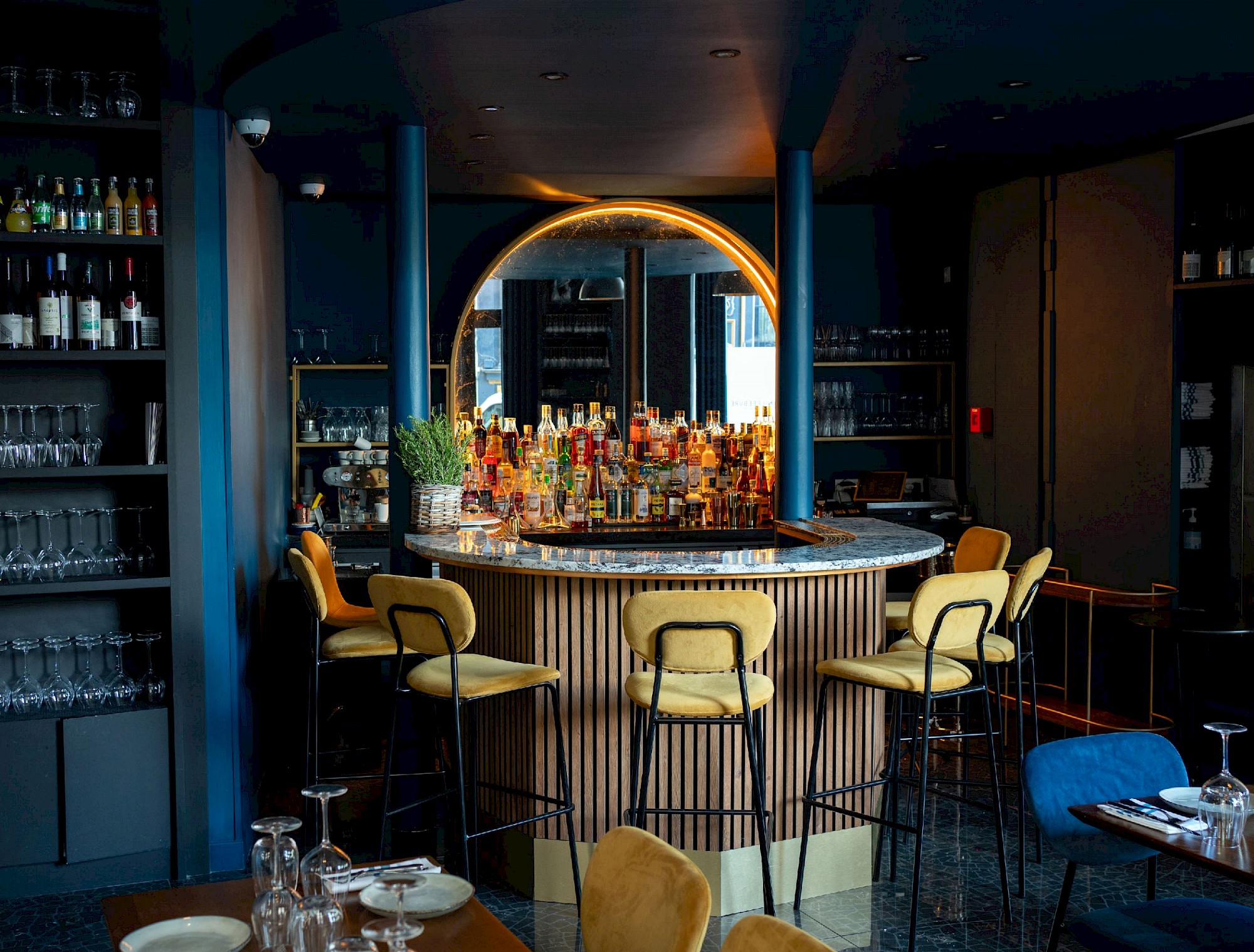 Rénovation d’un restaurant avec agencement sur mesure : Création de serrurerie, menuiserie, tapisserie, tables, banquettes et bar sur mesure. Réemploi de banquettes, tables et chaises existantes (modifiées, rénovées, retapissées). Revêtements muraux enduits de terre du Grand Paris. Lampes en papier réalisées à la main par Antoine Becognée.