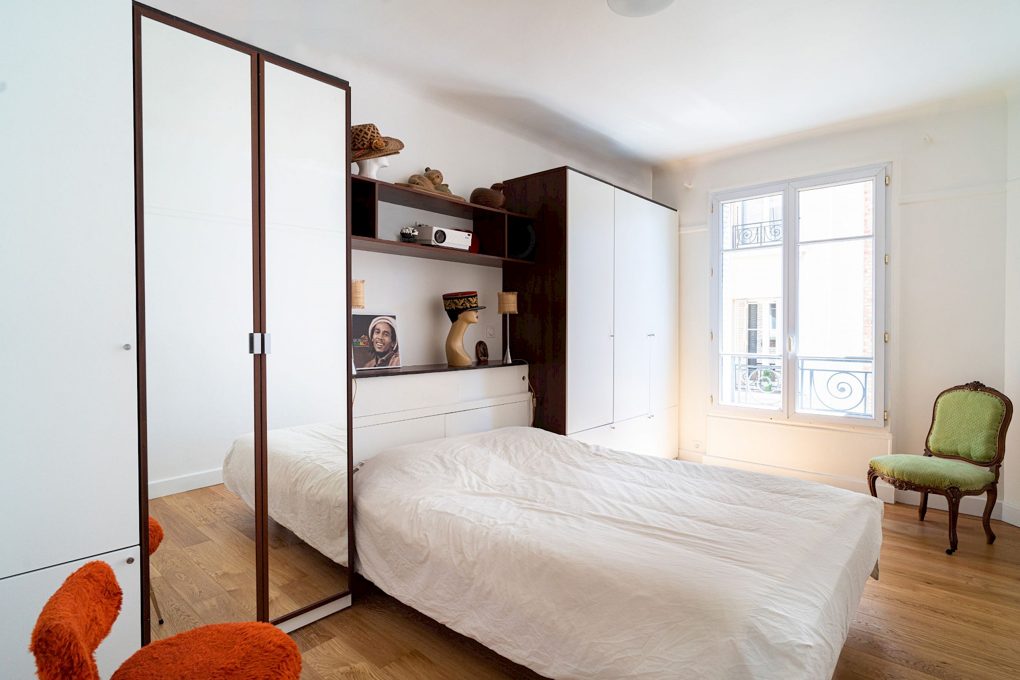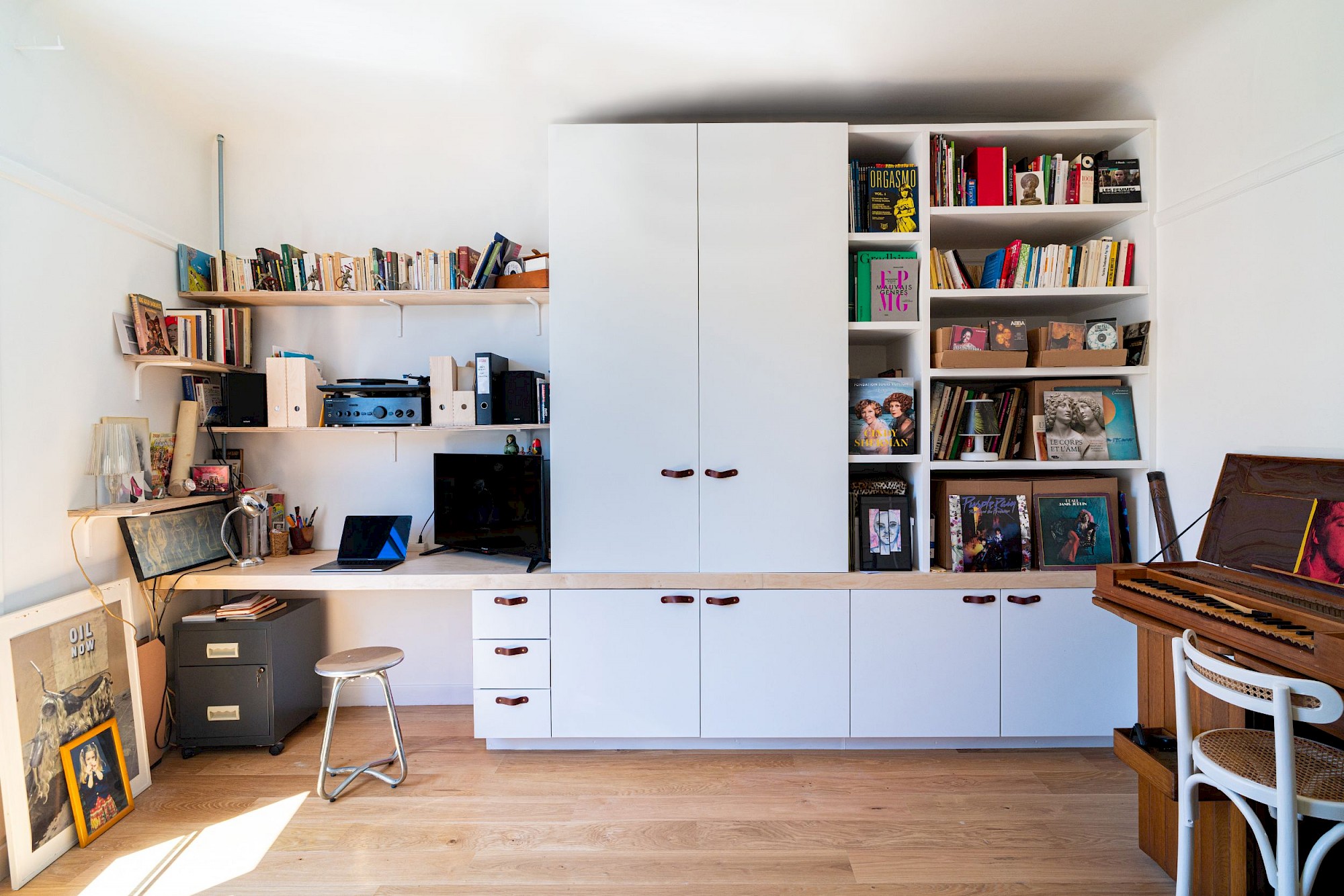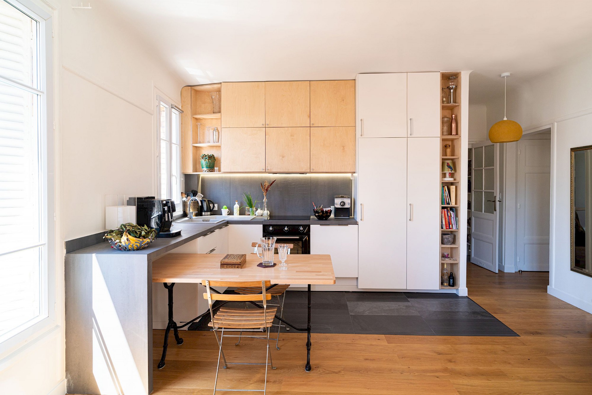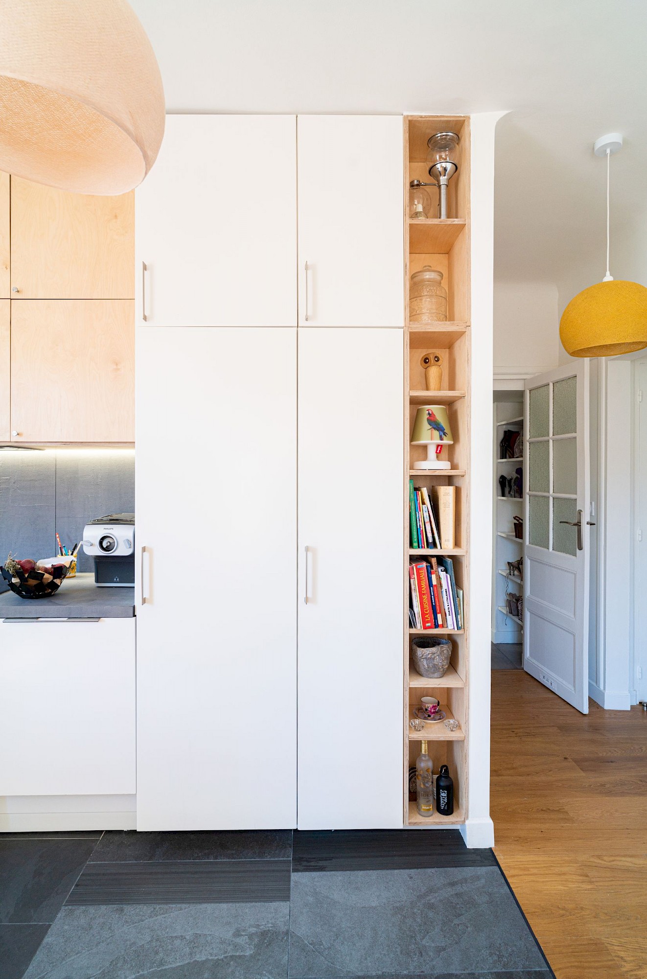 Rénovation complète d’un appartement, création d’un grand séjour-cuisine, création d’une bibliothèque-bureau sur mesure, création d’une tête de lit-armoire en réemploi de l’ancien mobilier, douche et mobilier de salle d’eau sur mesure.