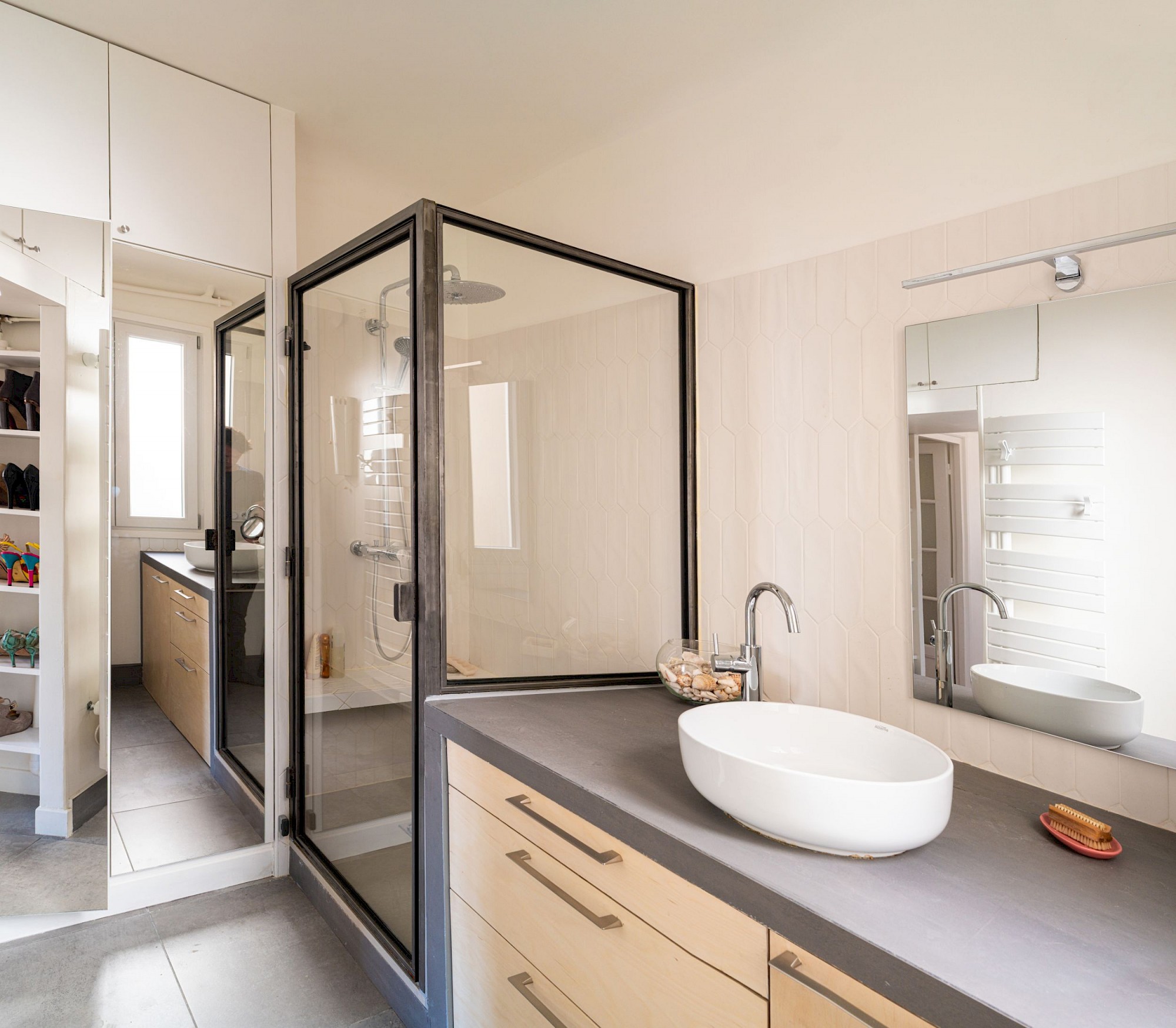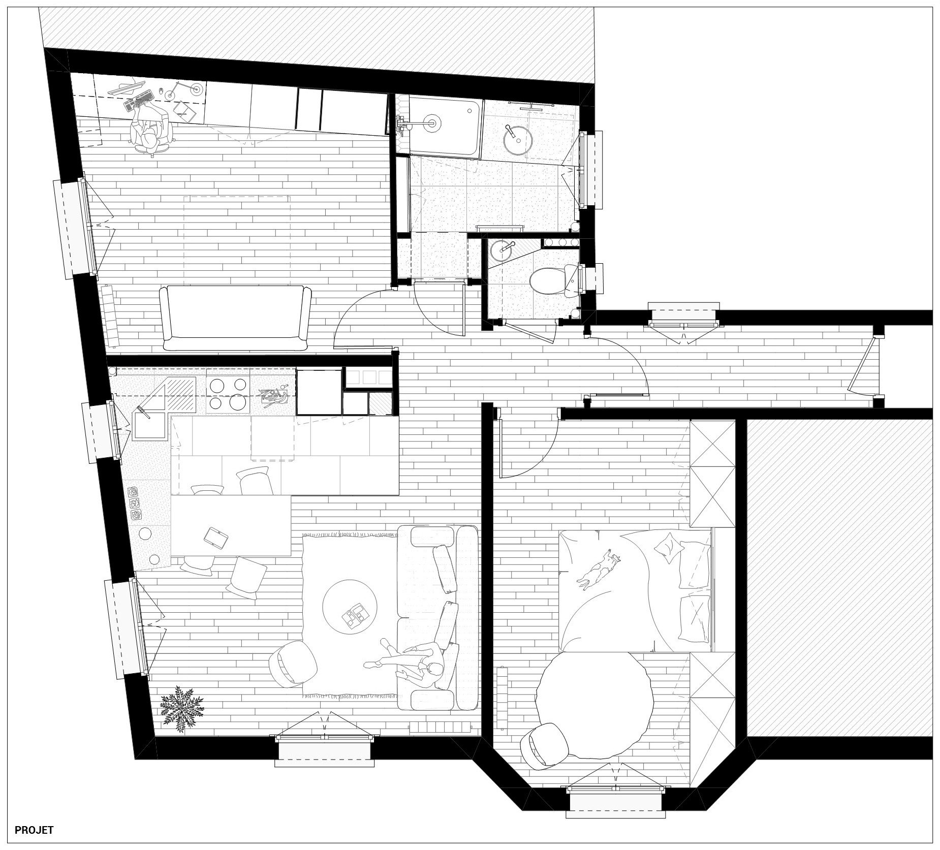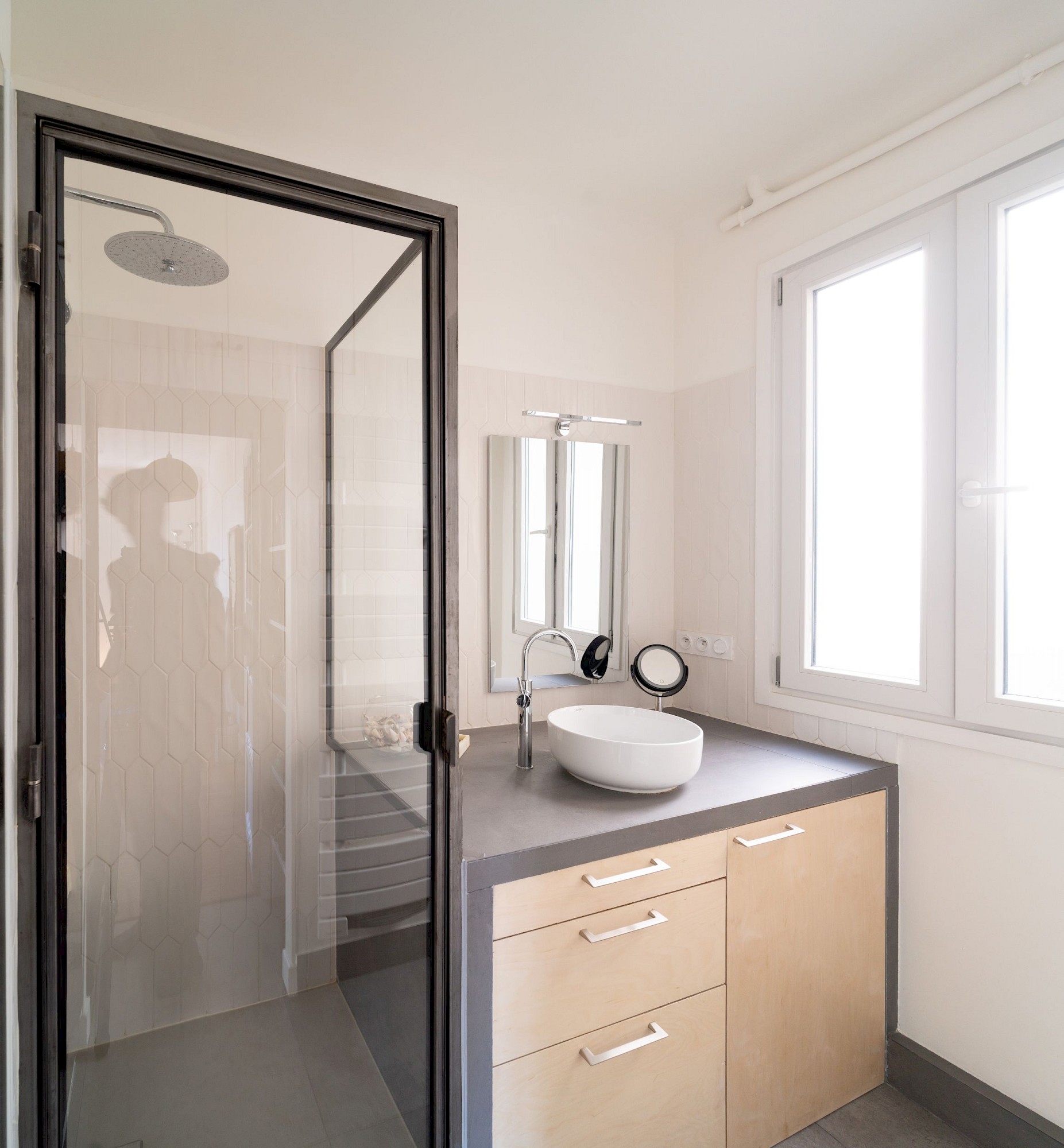 Rénovation complète d’un appartement, création d’un grand séjour-cuisine, création d’une bibliothèque-bureau sur mesure, création d’une tête de lit-armoire en réemploi de l’ancien mobilier, douche et mobilier de salle d’eau sur mesure.