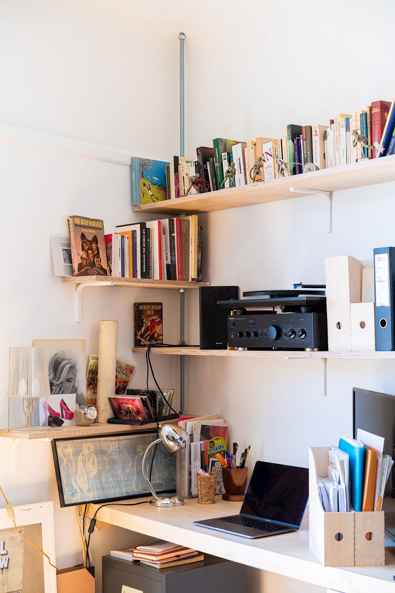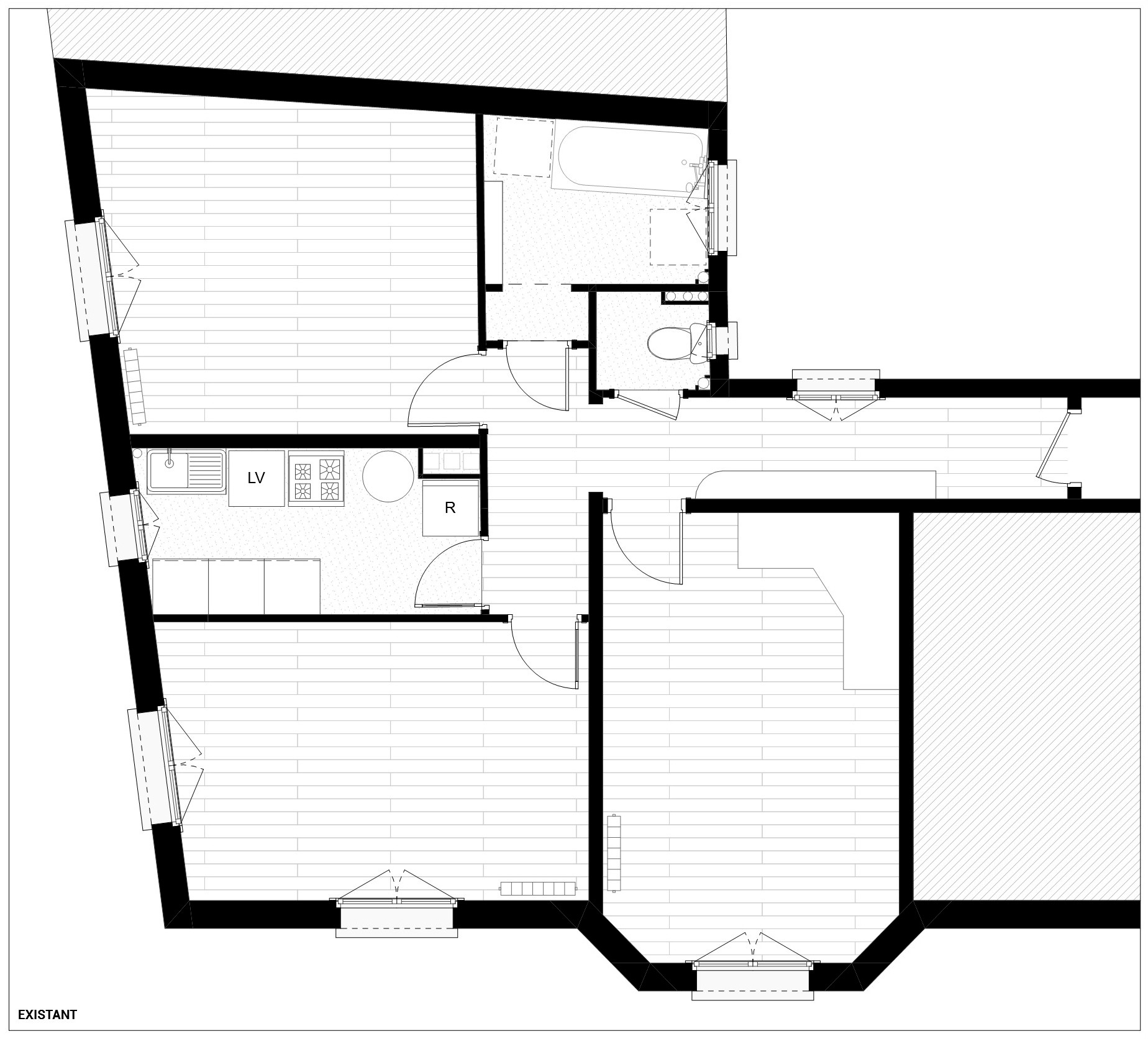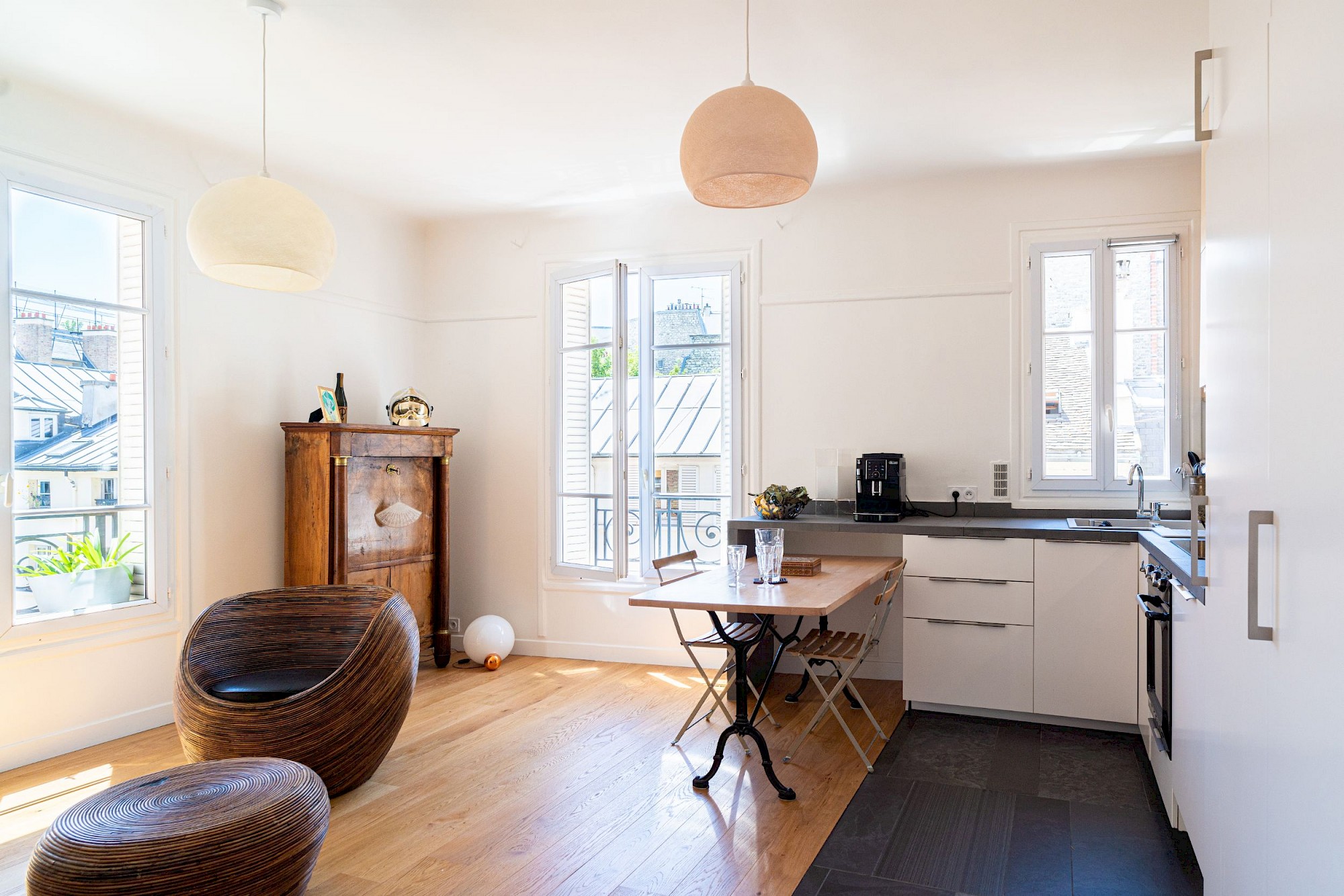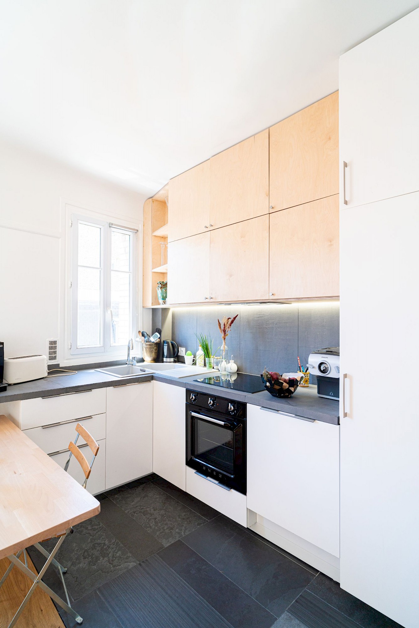 Rénovation complète d’un appartement, création d’un grand séjour-cuisine, création d’une bibliothèque-bureau sur mesure, création d’une tête de lit-armoire en réemploi de l’ancien mobilier, douche et mobilier de salle d’eau sur mesure.